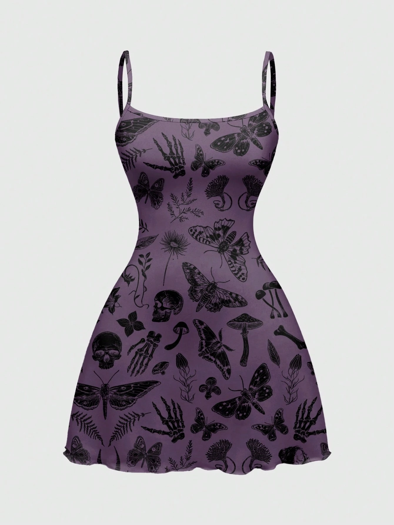 Goth Abito mini sexy e misterioso con stampa floreale e teschio
