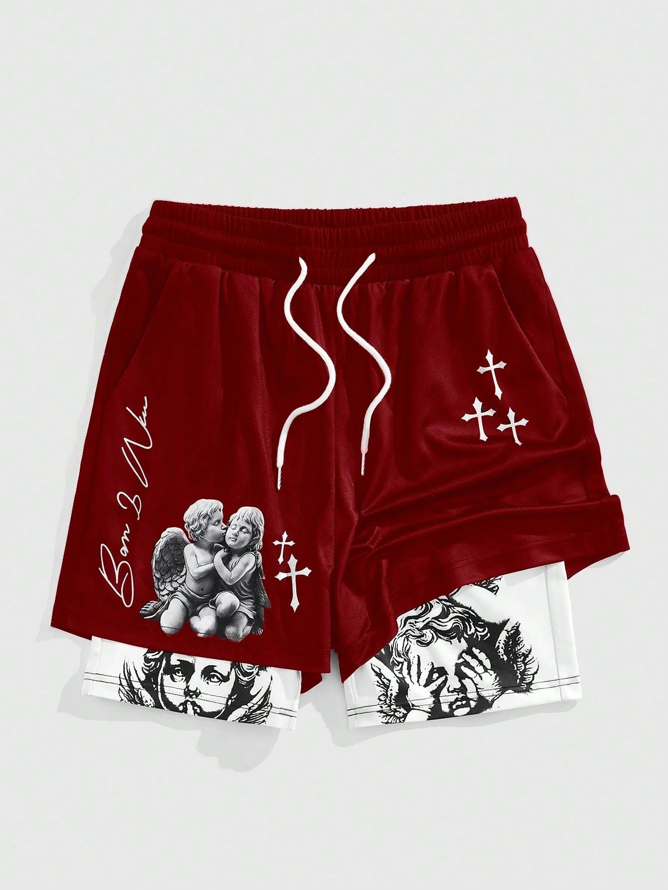 Goth Pantaloncini casual da uomo con vita con coulisse e stampa a croce angelica, versatili per uso quotidiano e attività sportive all'aperto
