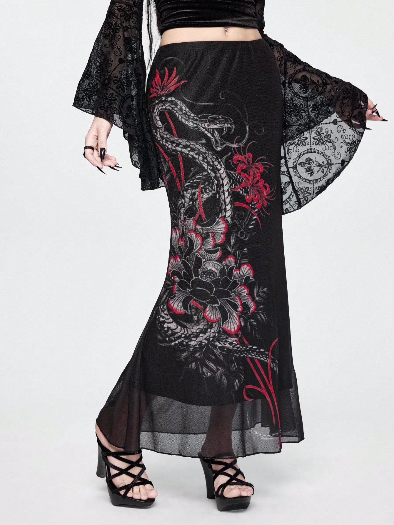 Goth Gonna a sirena aderente con stampa di ibisco e pelle di serpente in stile Dark Academia cinese