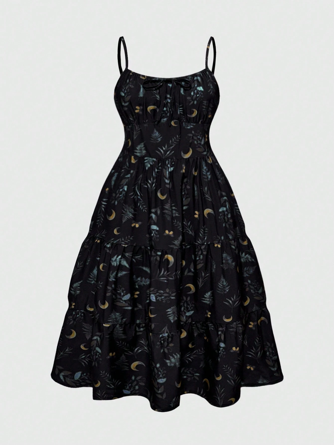 Goth Abito da donna con stampa retrò all-over di luna e piante, stile boho vacanziero, con spalline sottili, taglie comode