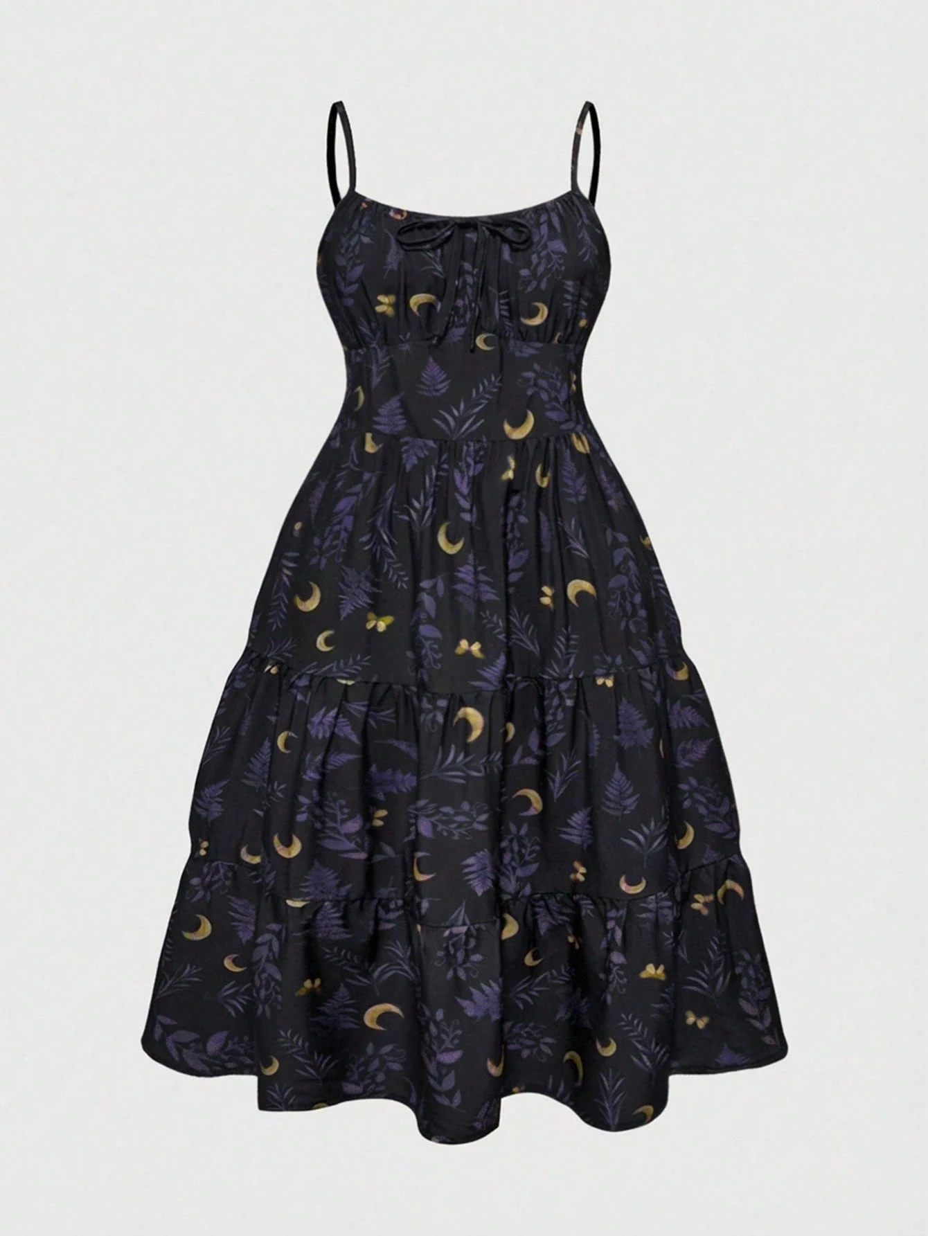 Goth Abito da donna con stampa retrò all-over di mezzaluna e piante, stile boho vacanziero, con spalline sottili, taglie comode