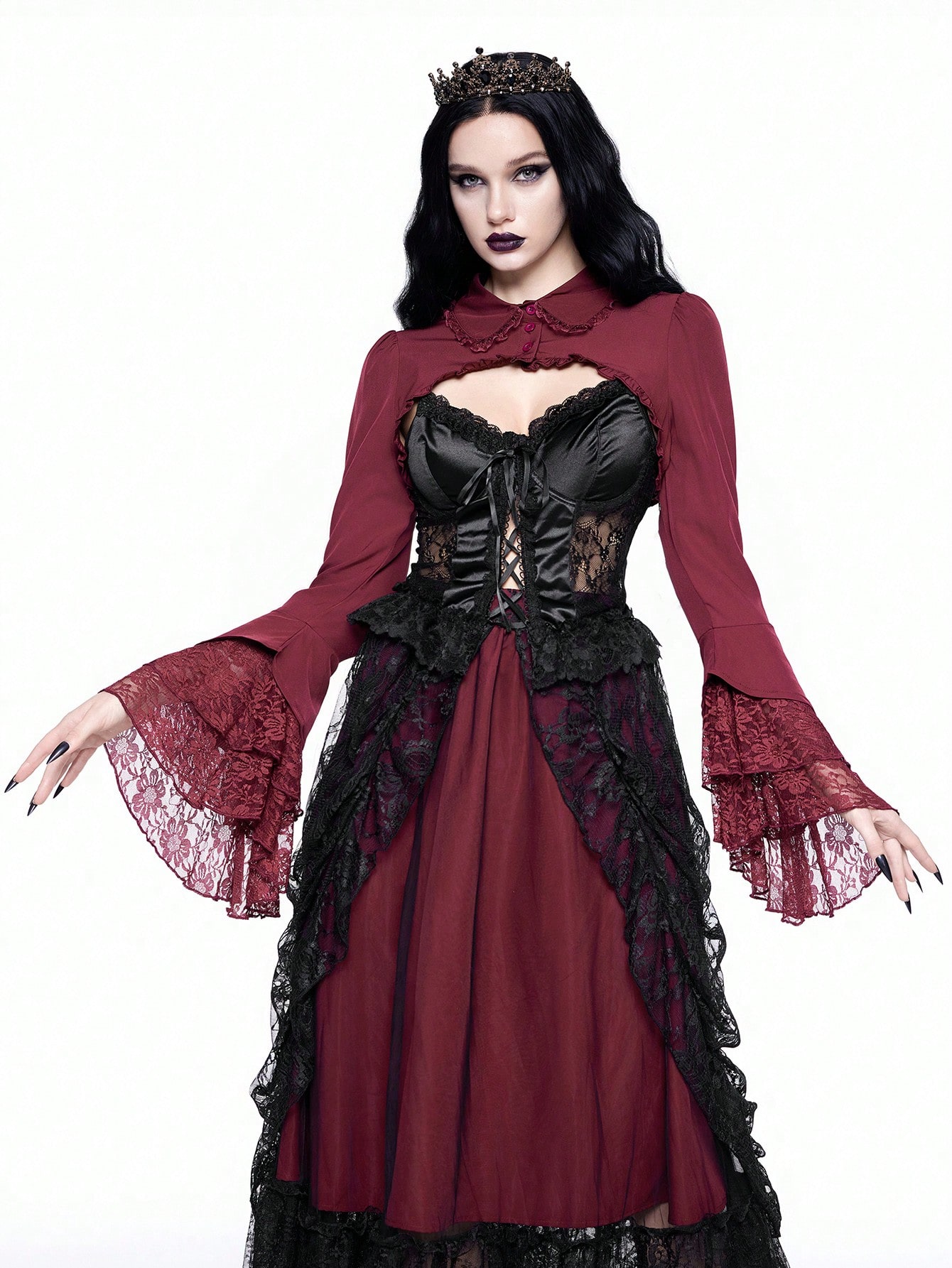 Blusa vintage in pizzo con maniche a campana, tono rosso vino scuro, con effetto vampiresco