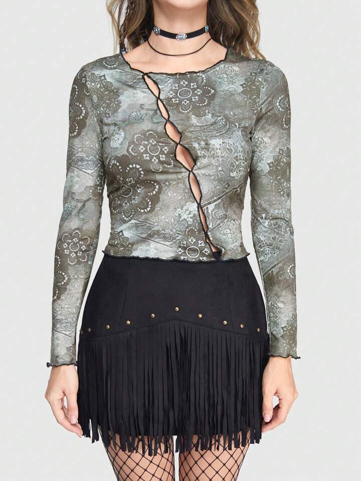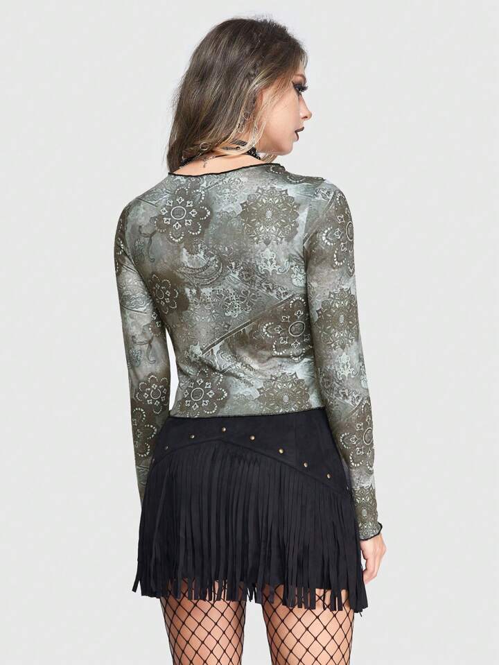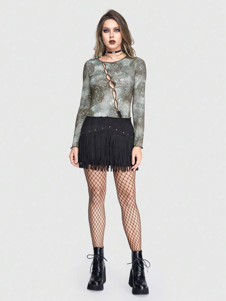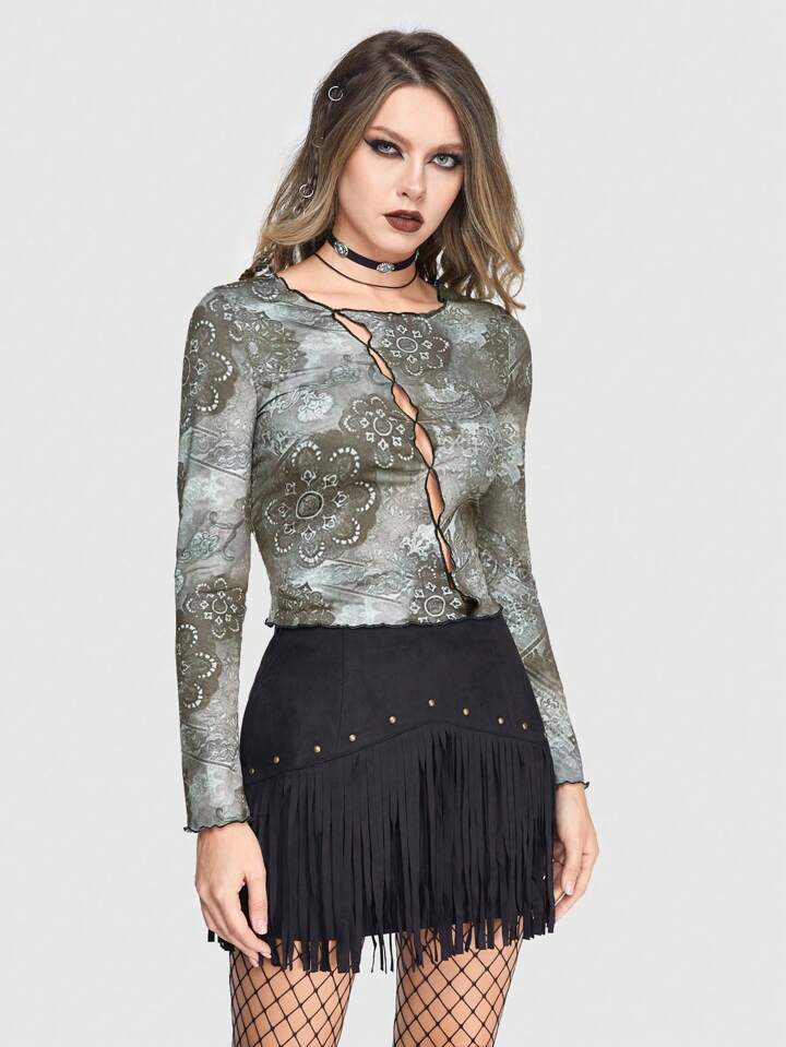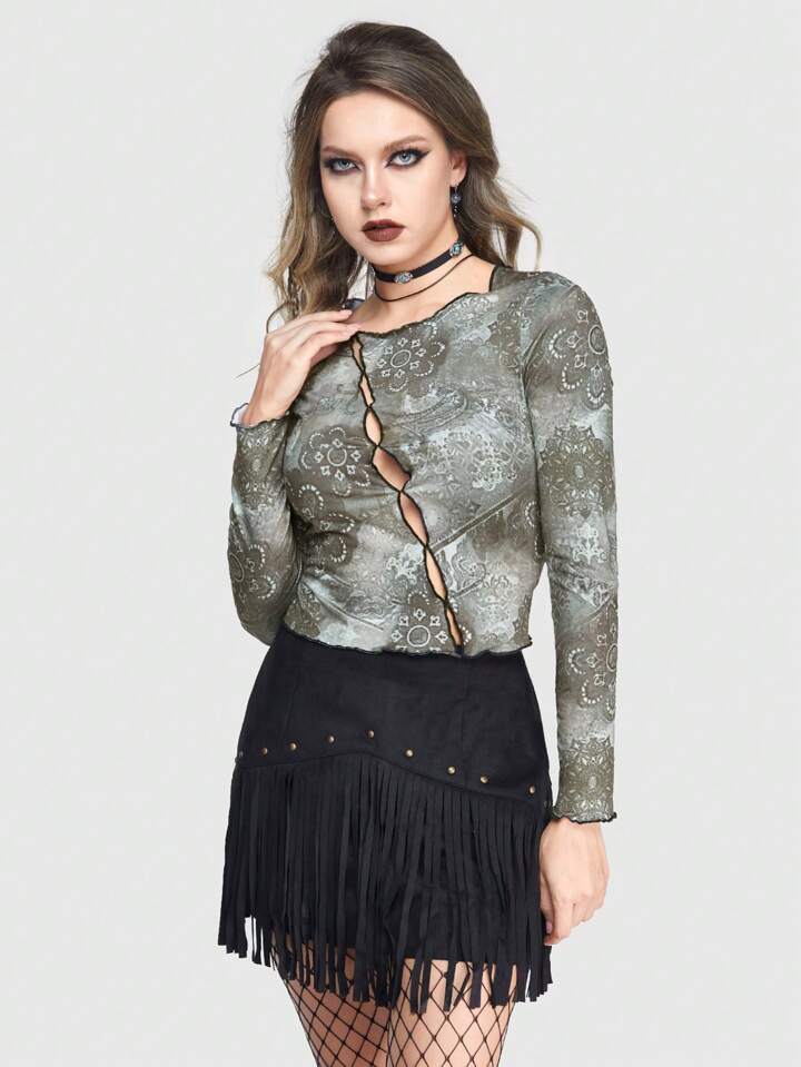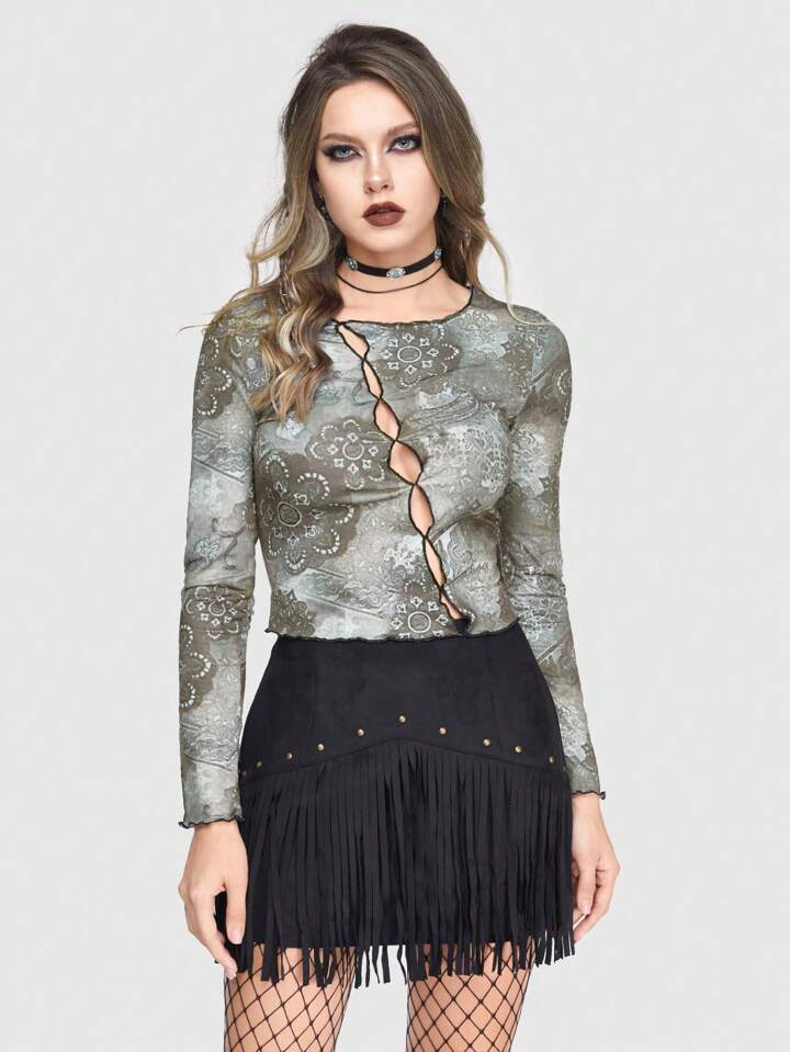Goth Maglietta Vintage Stile Aderente Con Design Tagliato Con Goccia D'acqua Per Donne, Con Bordo A Taglio Vivo