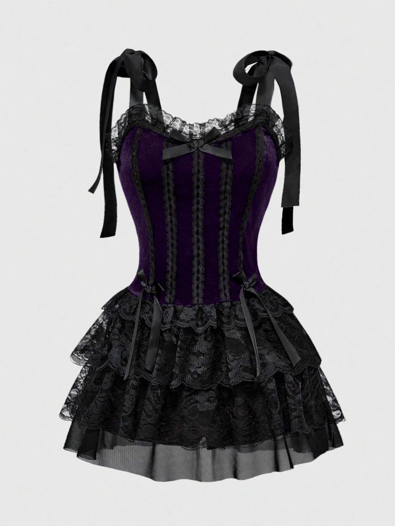 Goth Abito da donna in stile gotico vintage da palazzo, con contrasto di colori, bordo in pizzo e velour, senza schienale