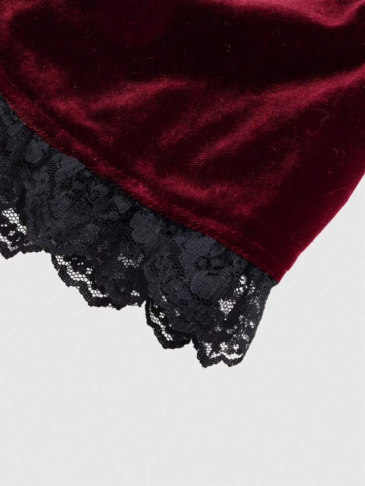 Goth Donna Maglia a maniche lunghe con fiocco in velluto e pizzo a contrasto, autunnale