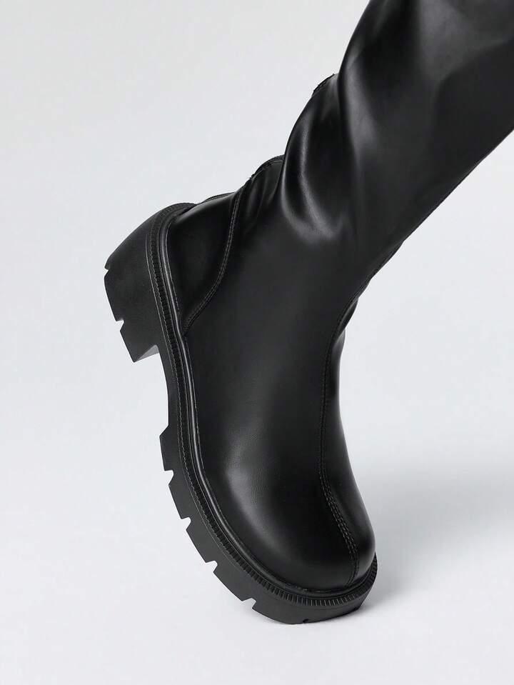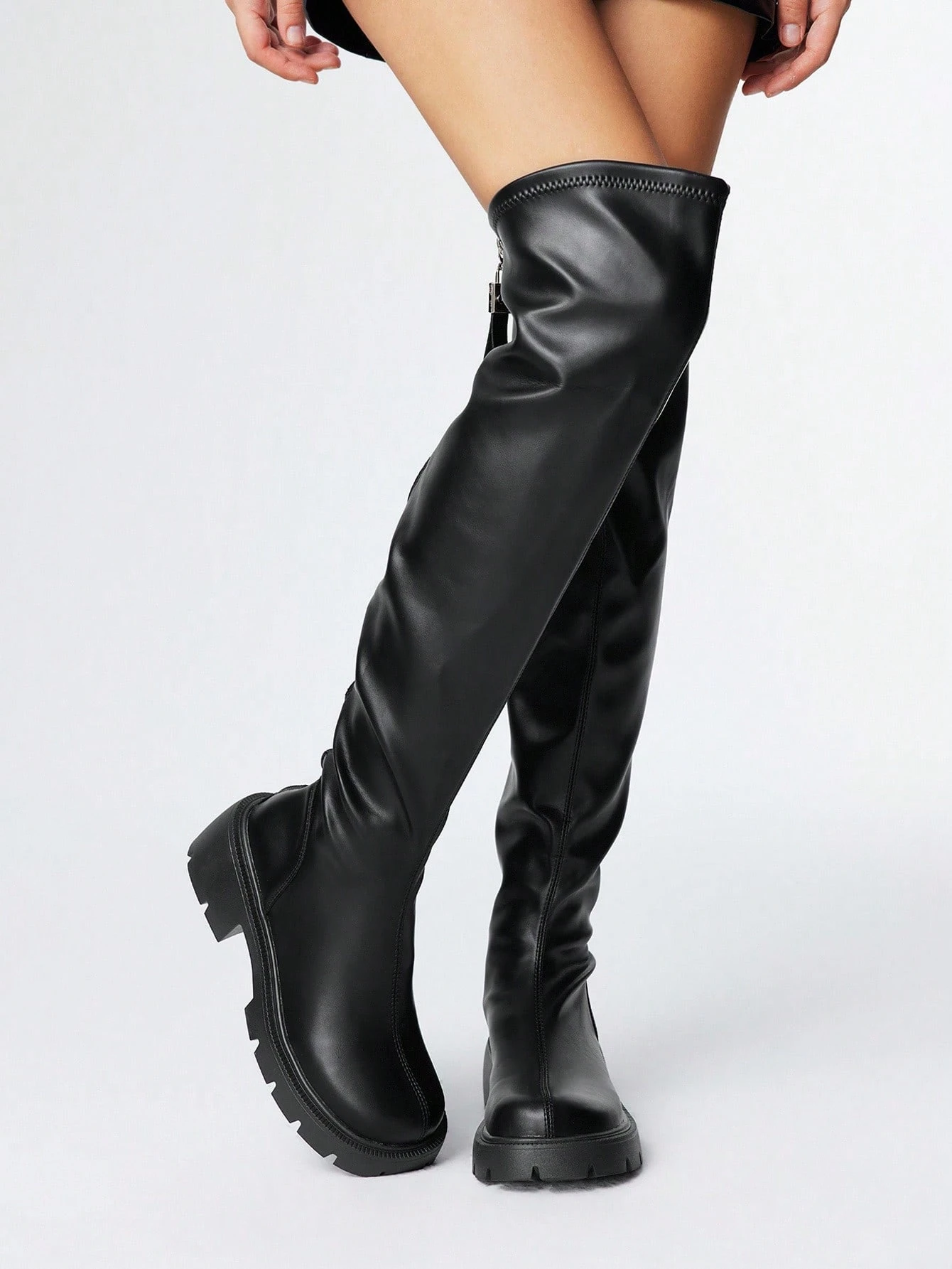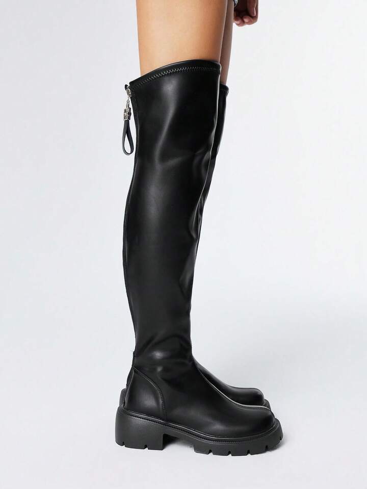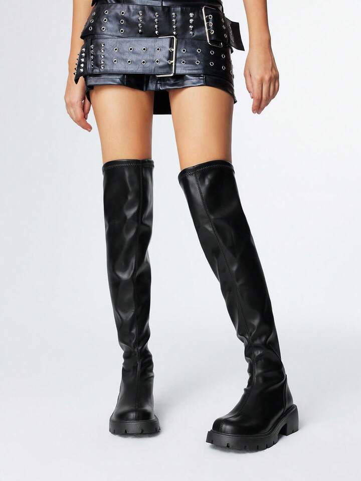 Goth Stivali alti da donna in tessuto elastico nero, stivali da equitazione con tacco basso, stivali sopra il ginocchio