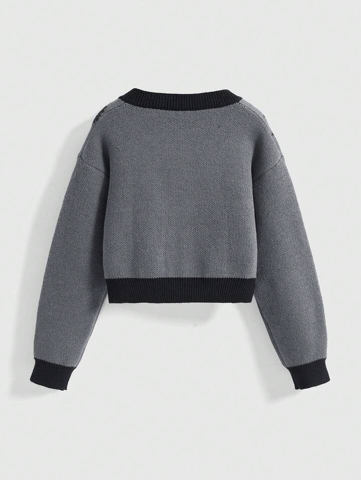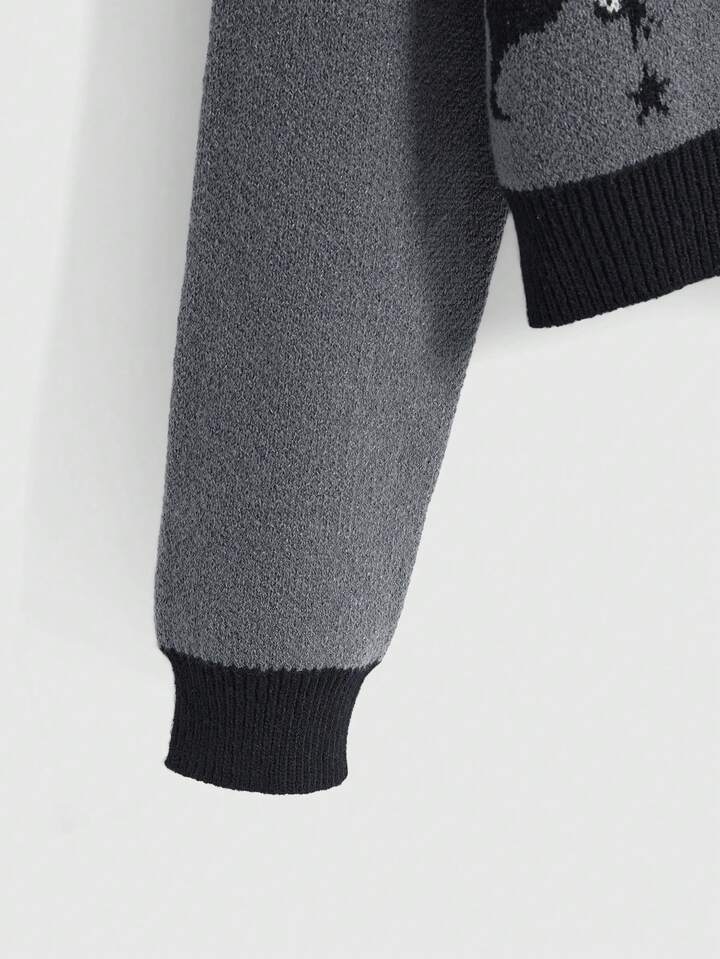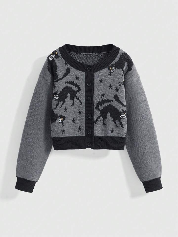 Goth Cardigan casual da donna con scollo tondo, maniche lunghe a goccia, in maglia jacquard con motivo a stelle e gatti, in colori a contrasto, adatto per Ognissanti
