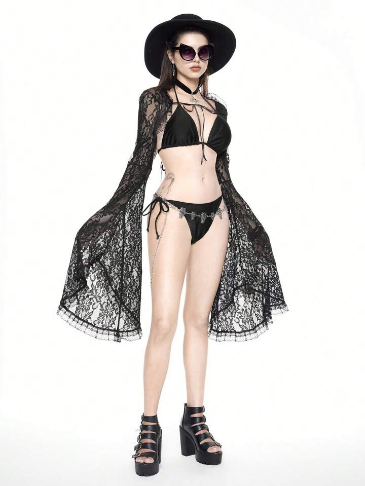 Goth Kimono corto aperto davanti in pizzo da donna, trasparente, per l'estate e le vacanze al mare