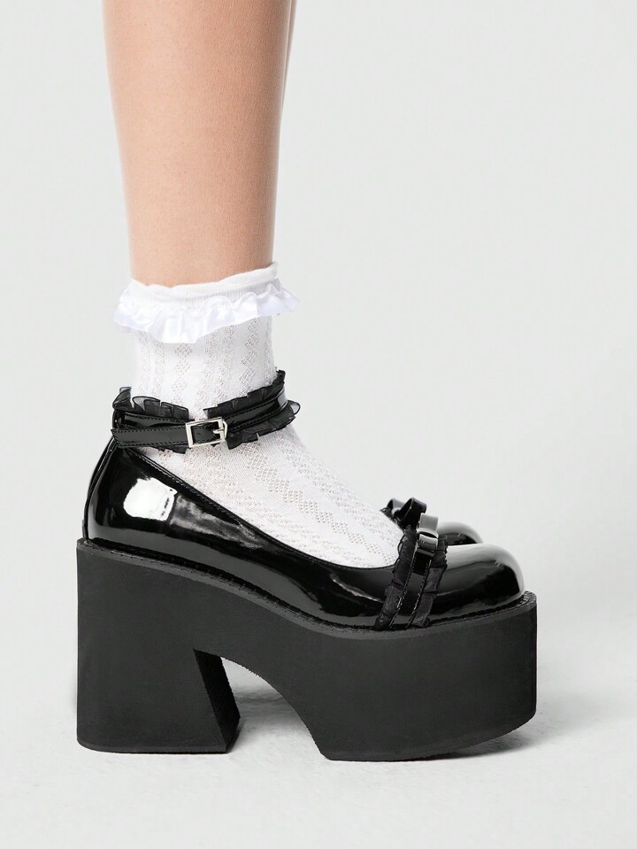 Goth Scarpe da donna Mary Jane con fiocco, rifinite in rete con motivi floreali, punta tonda, tacco con zeppa, stile carino e scuro, colore nero, adatte per uso quotidiano e scolastico, scarpe primaverili, primavera, Pasqua