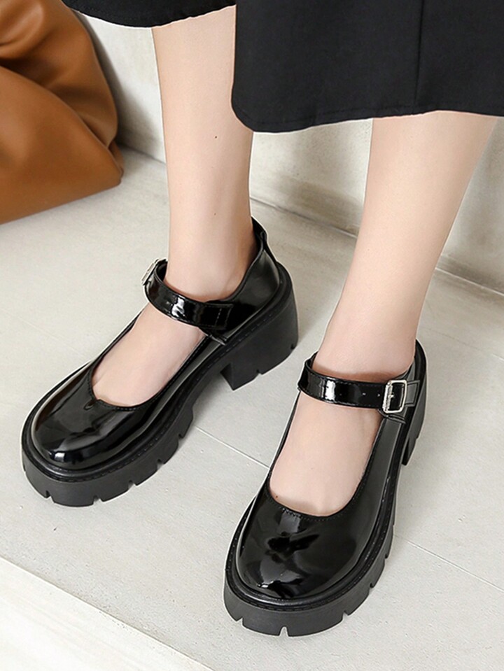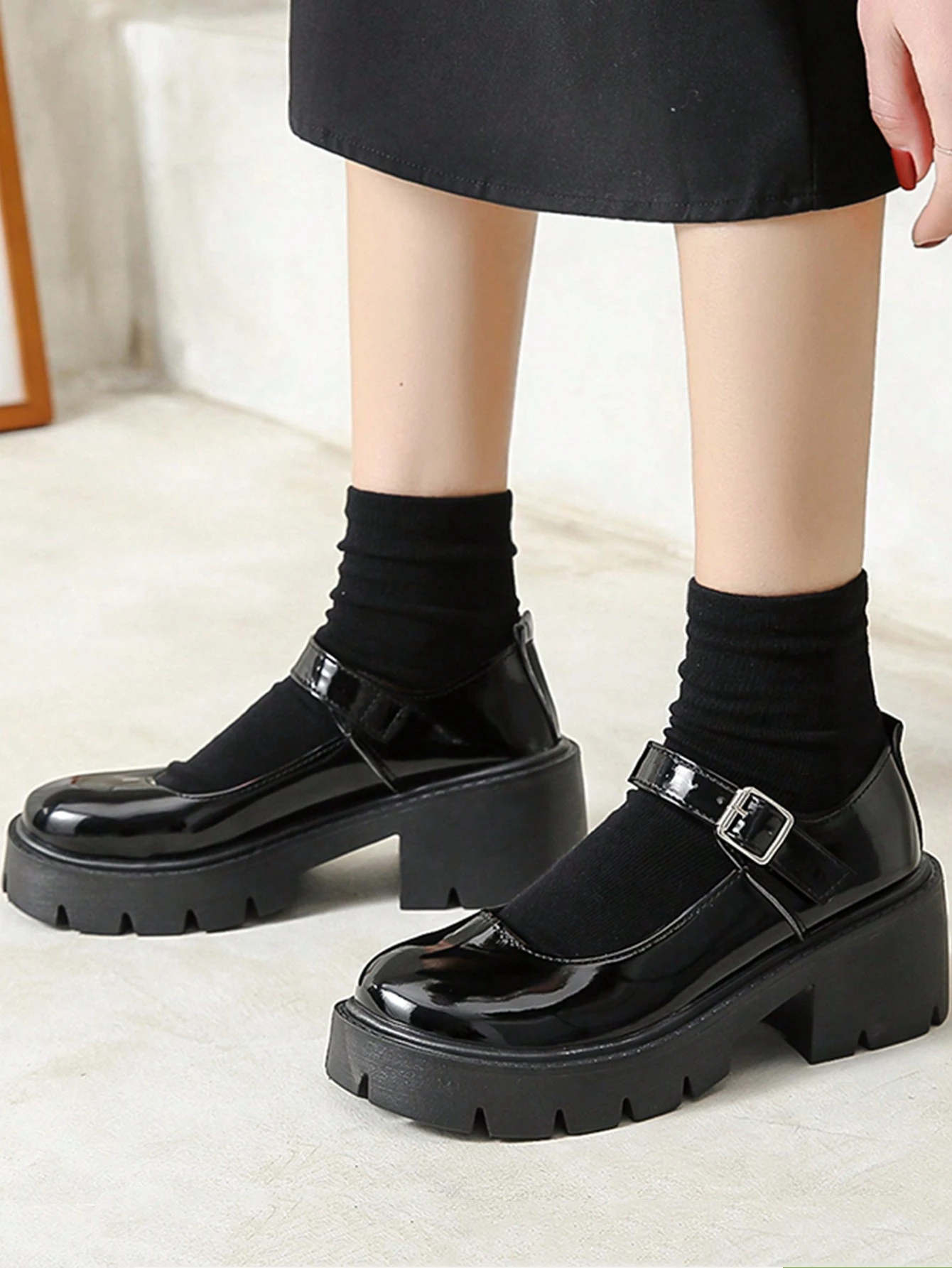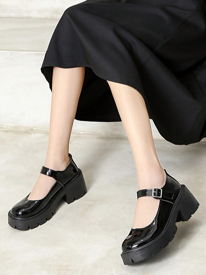 Goth Scarpe Mary Jane Nere In Stile College Con Zeppa Spessa E Tacchi Grossi Lucidi Per Donne Con Cinturino Con Fibbia