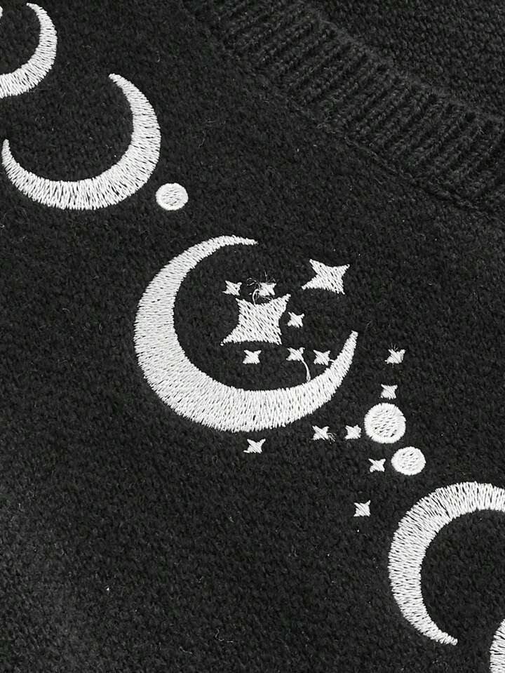 Goth Cardigan Corto A Maglia Da Donna Con Scollo A V E Ricamo Stelle E Luna
