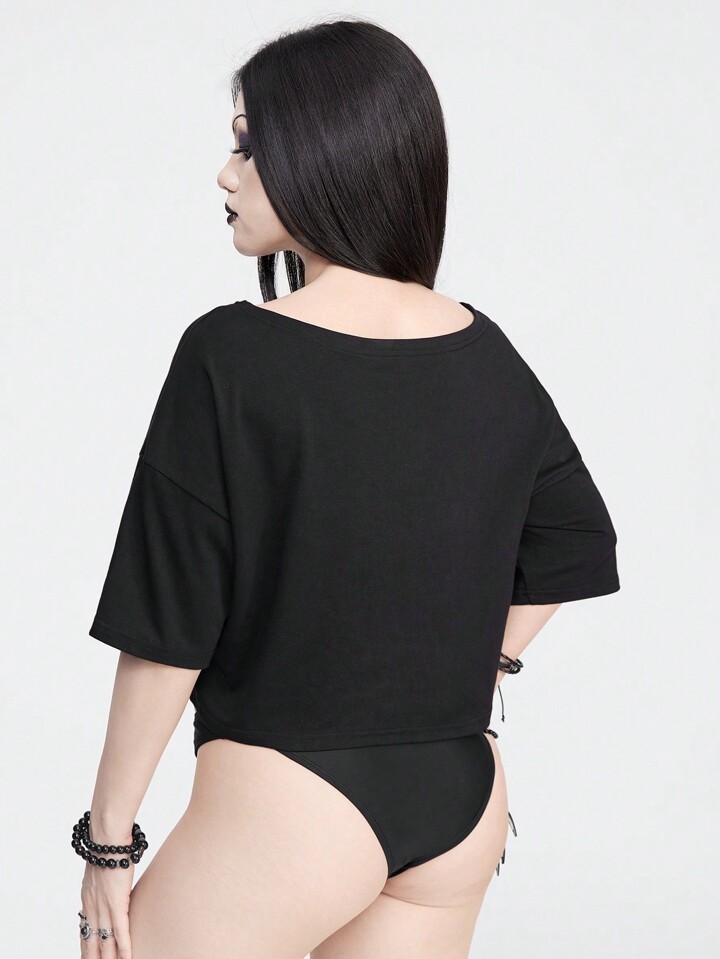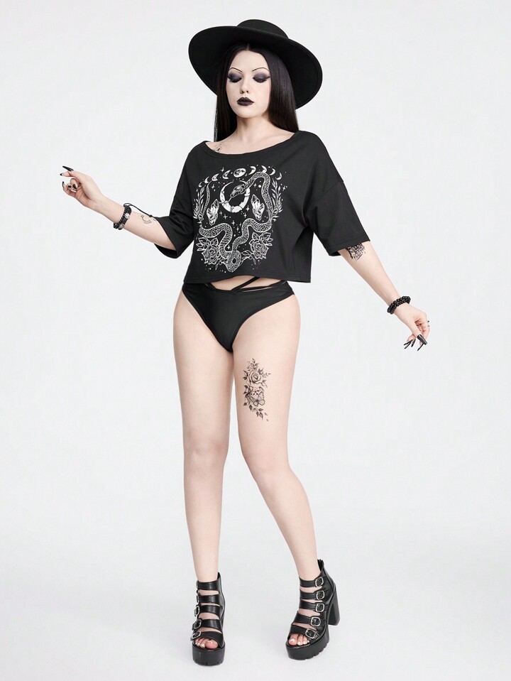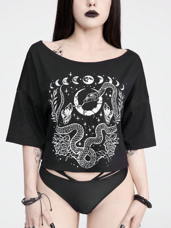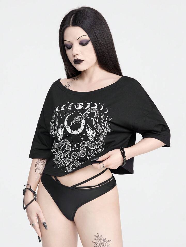 Goth Maglietta con stampa stella, luna, serpente e fiori, maniche cadenti estive da donna e lunghezza corta