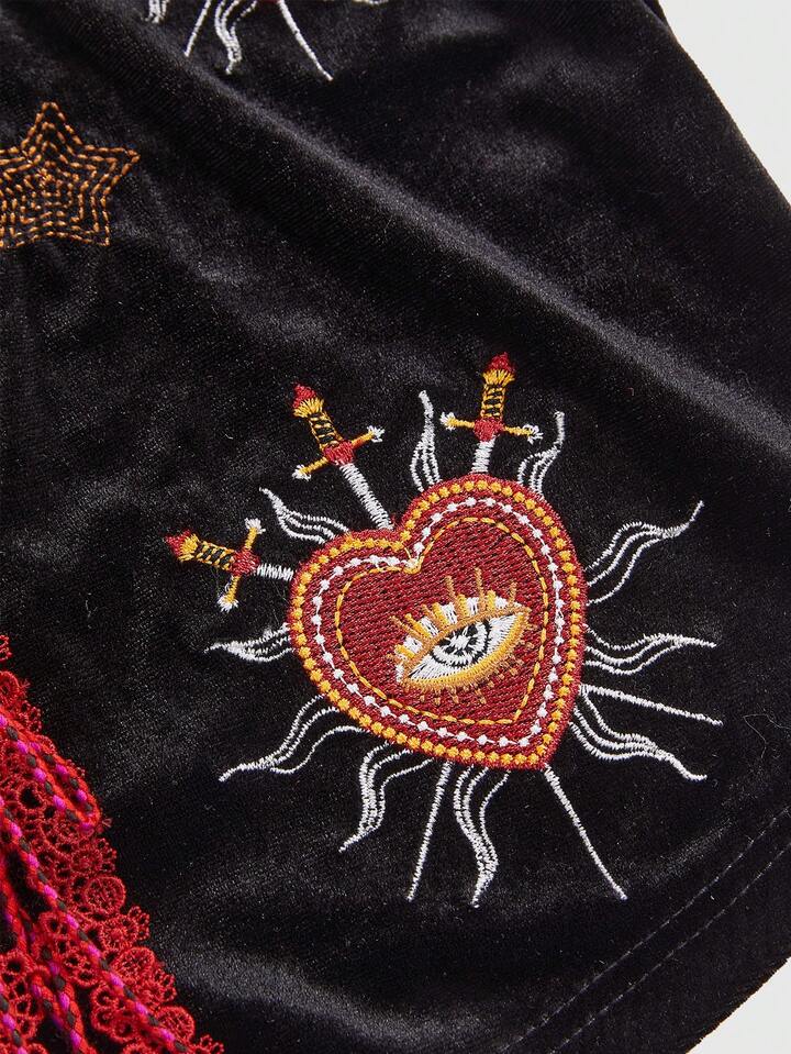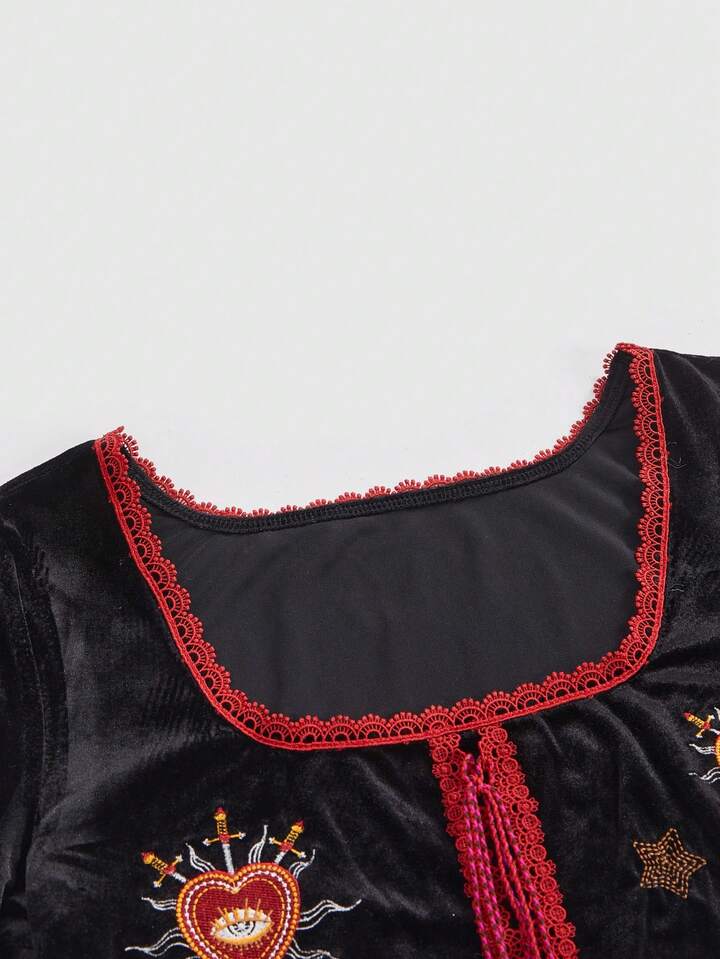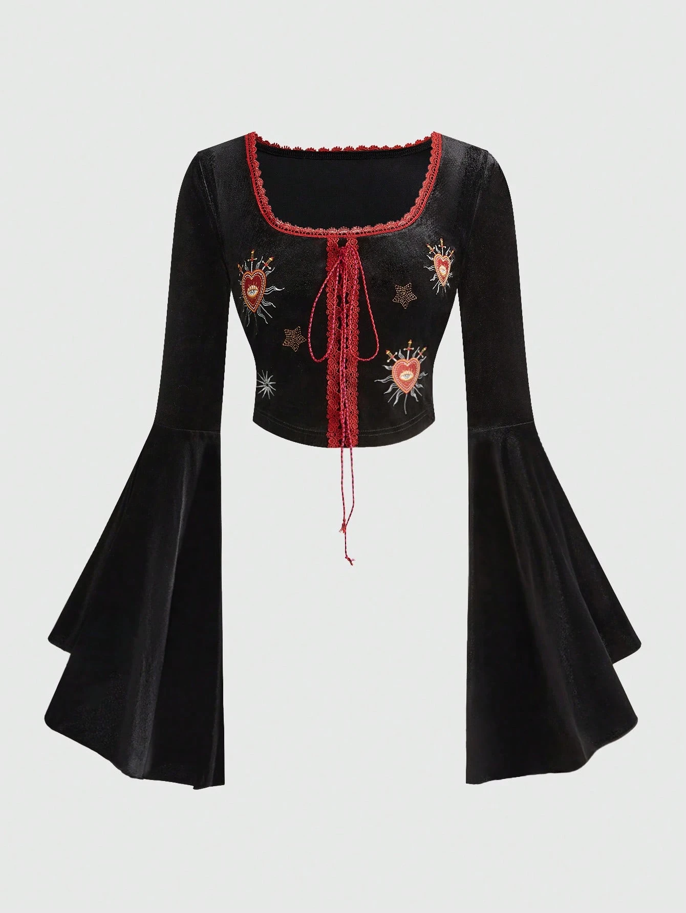 Goth Maglietta aderente in velluto da donna con ricami di streghe, cuori, croci e stelle, versatile