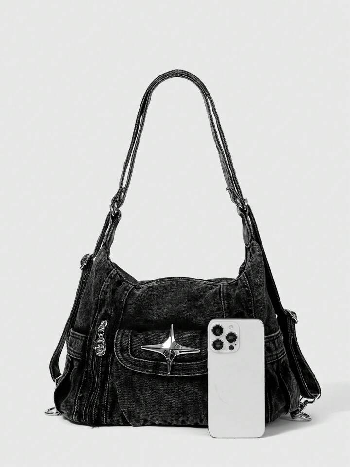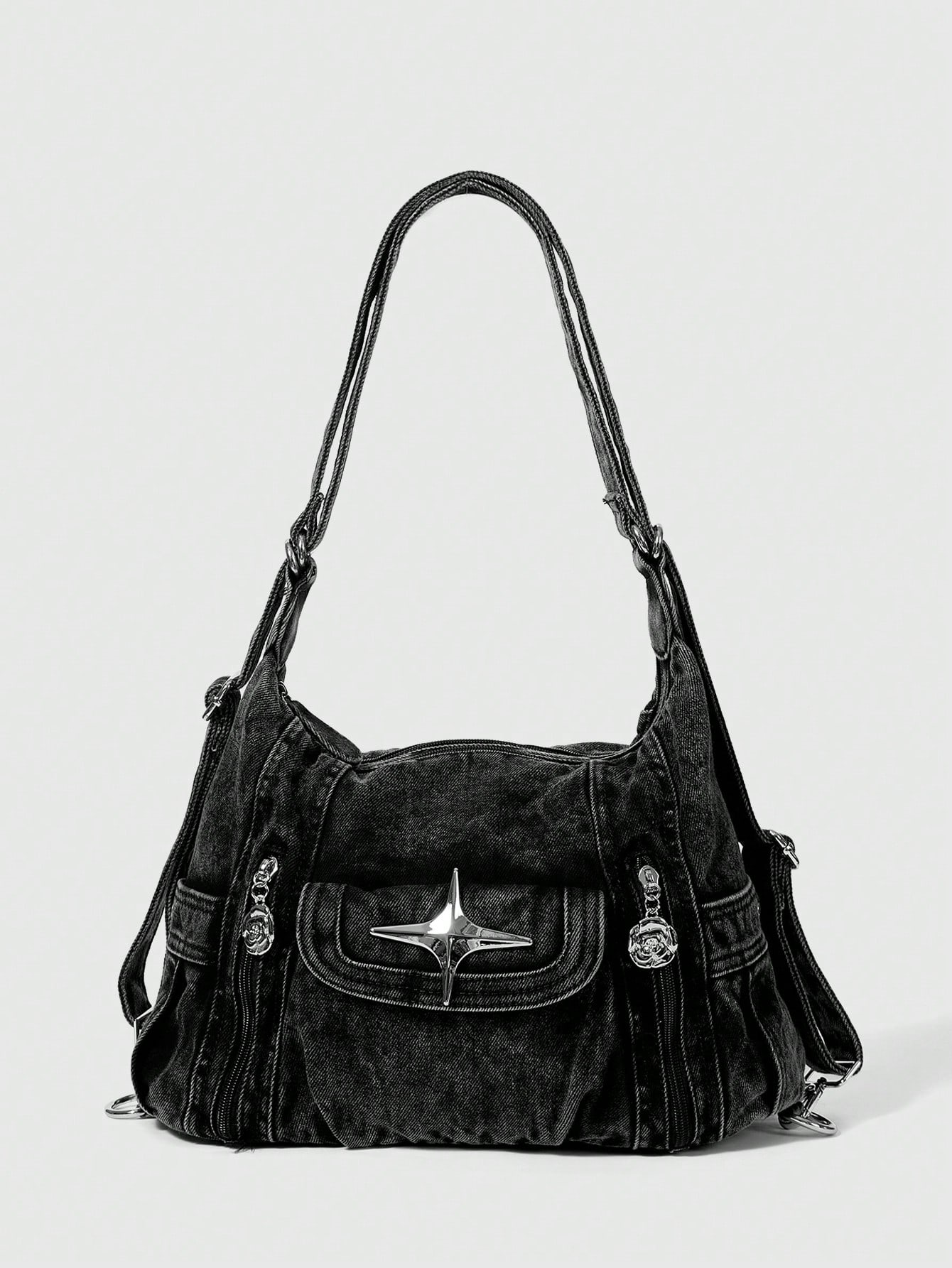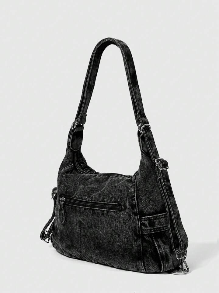 Goth Borsa a tracolla stile Punk Y2K con molteplici tasche, borsa shopping in denim stile vintage lavato e consumato, di grande capacità, per le donne
