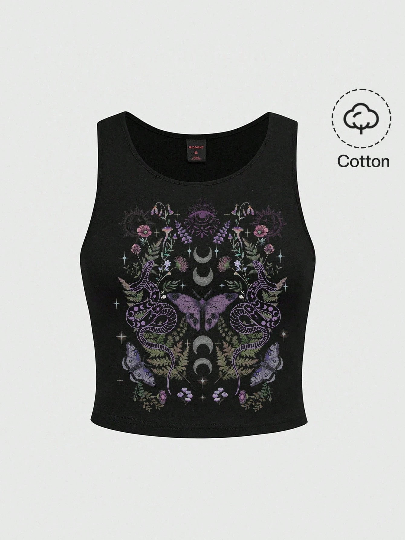 Goth Canotta nera taglie forti con stampe estetiche gotiche di farfalla, luna, occhio di serpente e piante