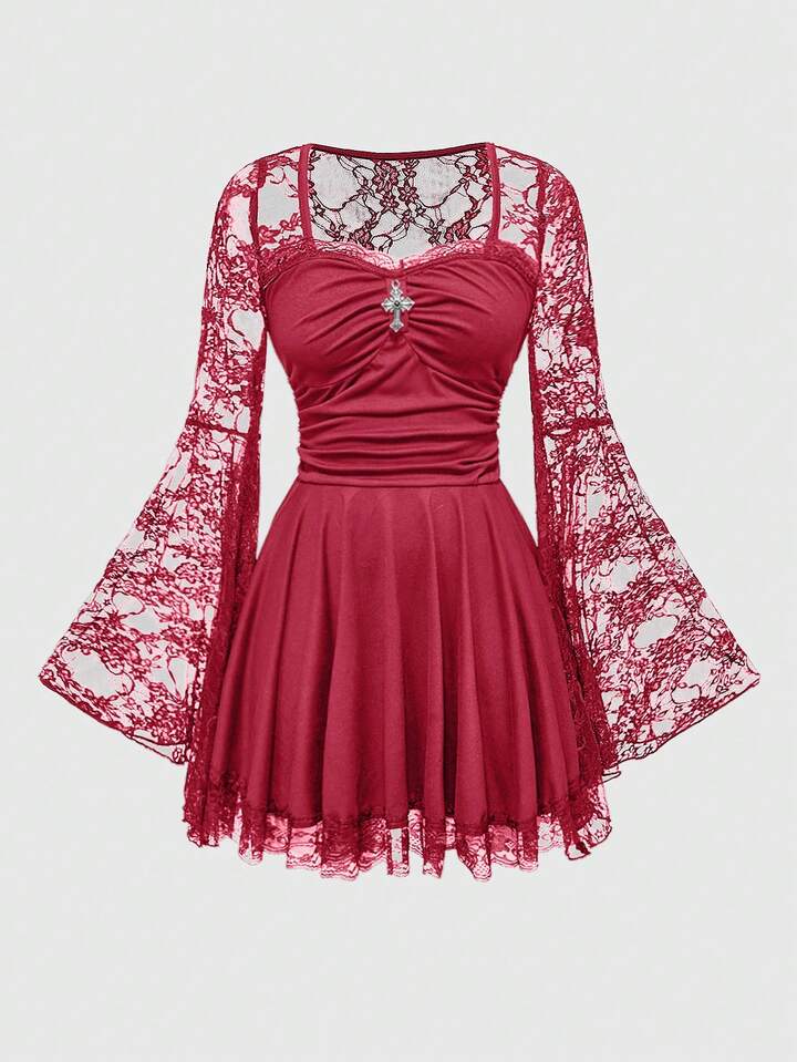 Goth Abito natalizio da donna a-line con scollo quadrato, maniche a sbuffo, patchwork in pizzo e dettagli gotici