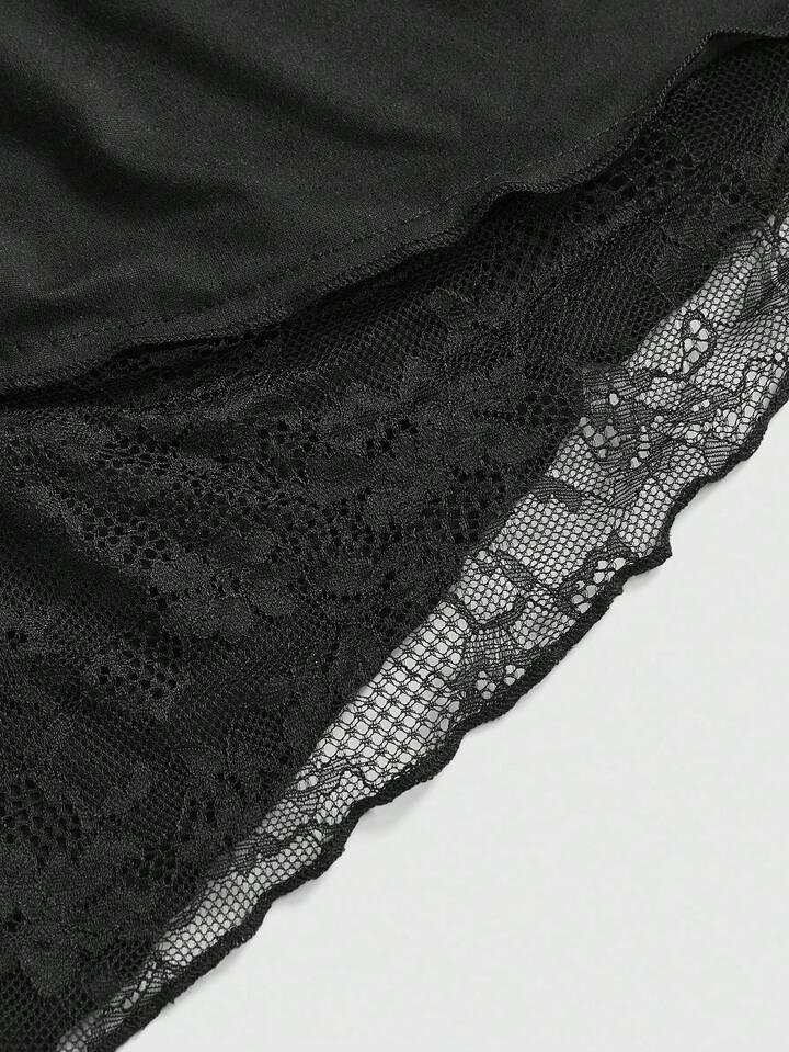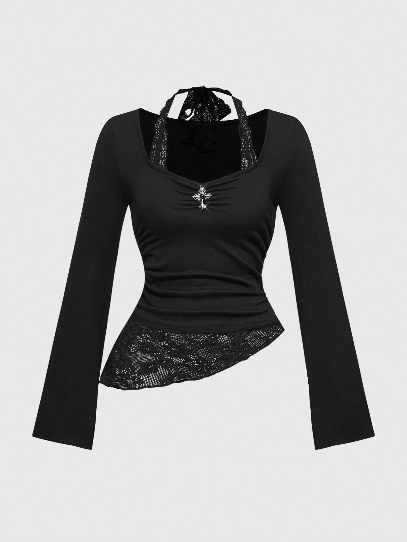 Goth maglietta da donna attillata con collo a lupetto, maniche a zampa di taglia normale, con patch in pizzo e pendente a croce gotico