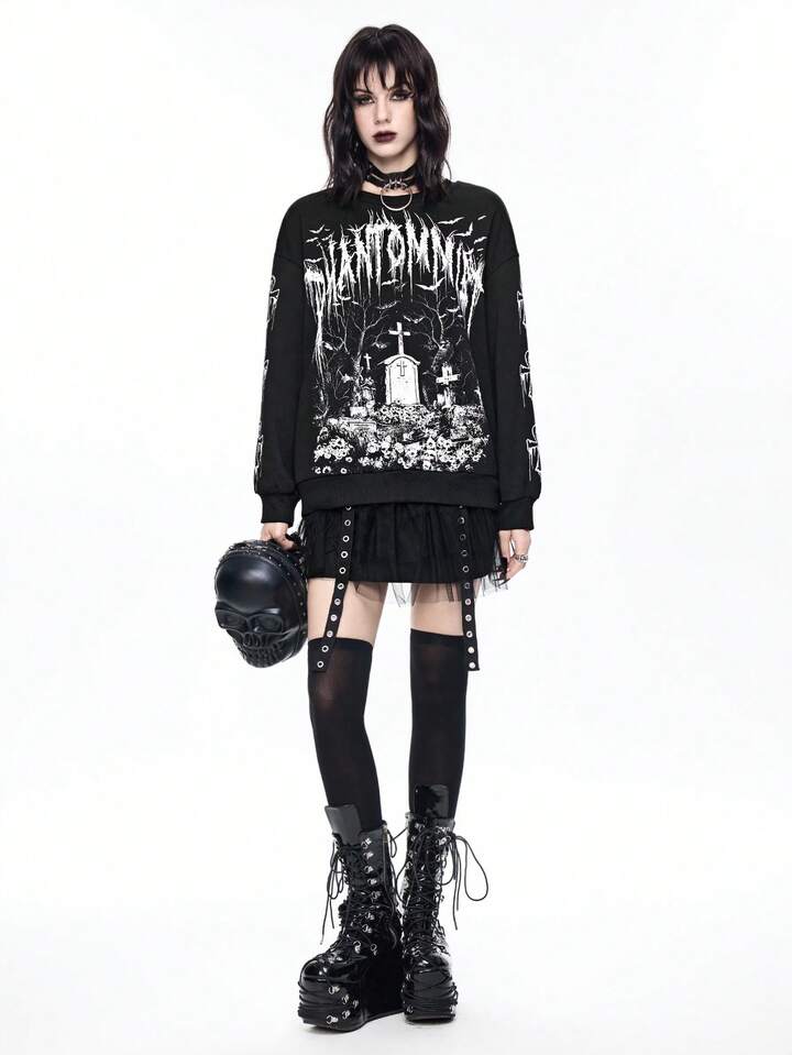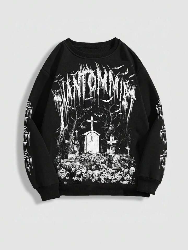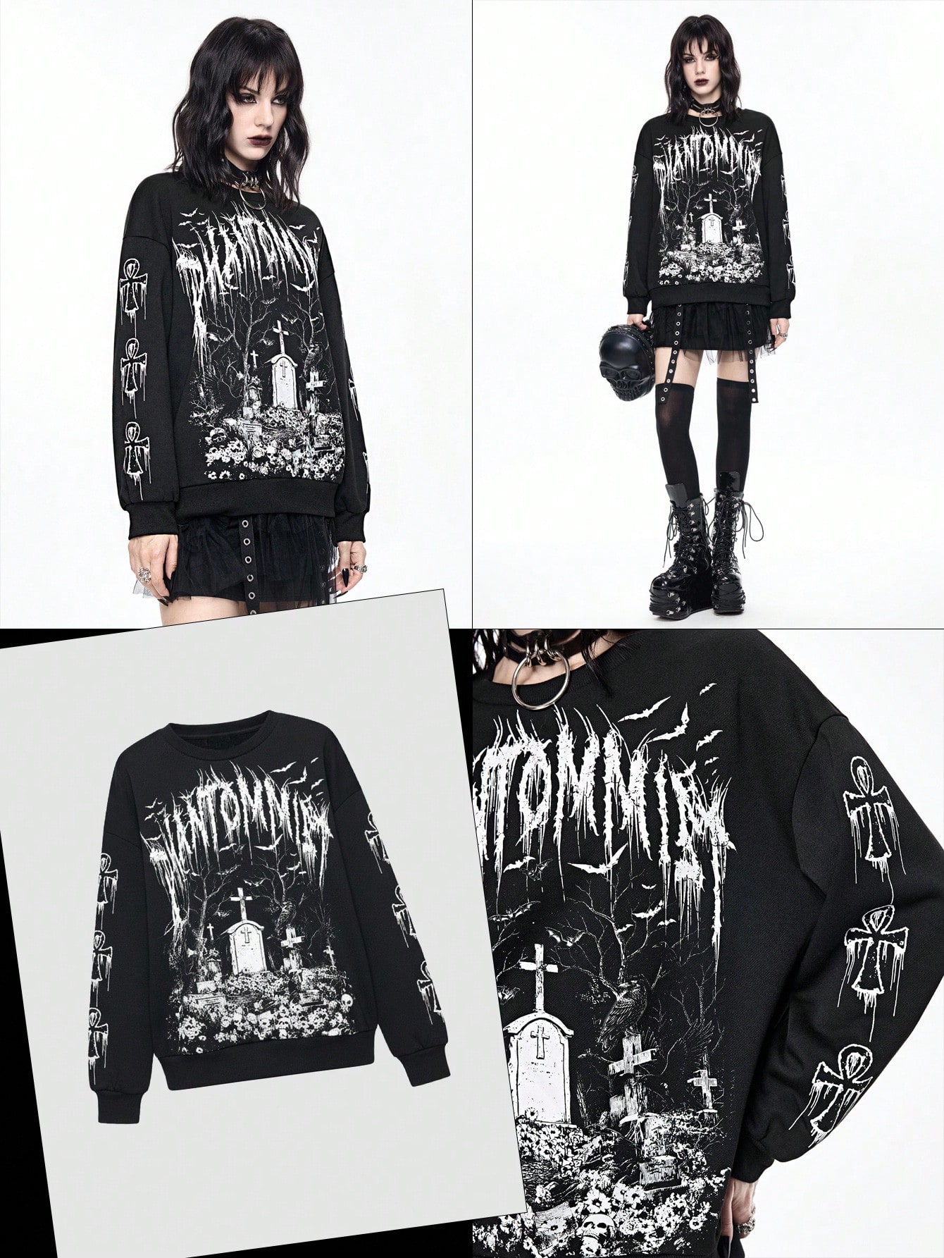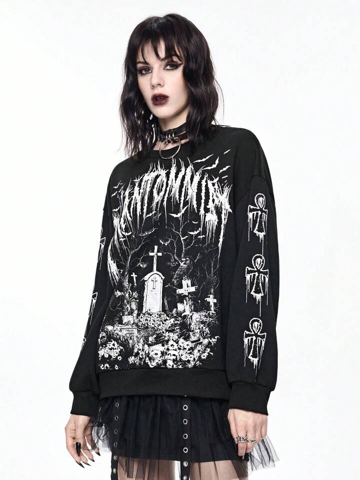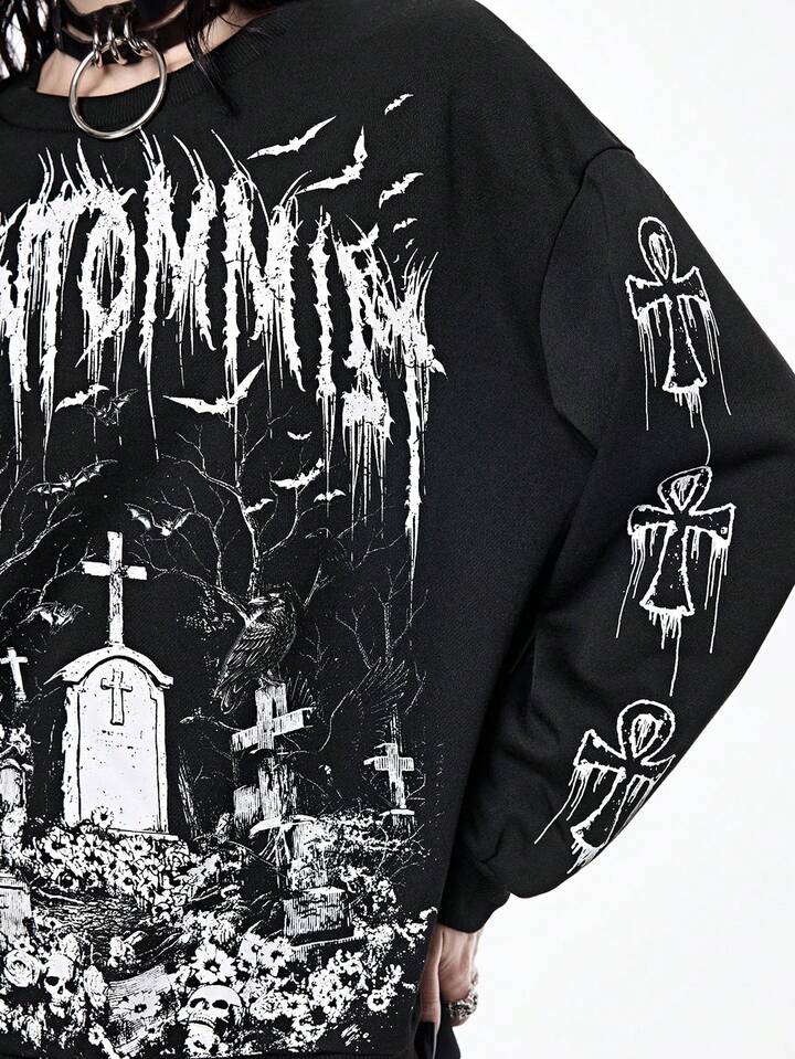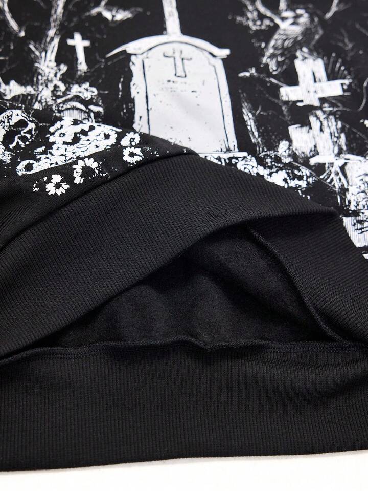Goth Felpa con stampa gotica a croce e lapide, con vibrazioni horror scure
