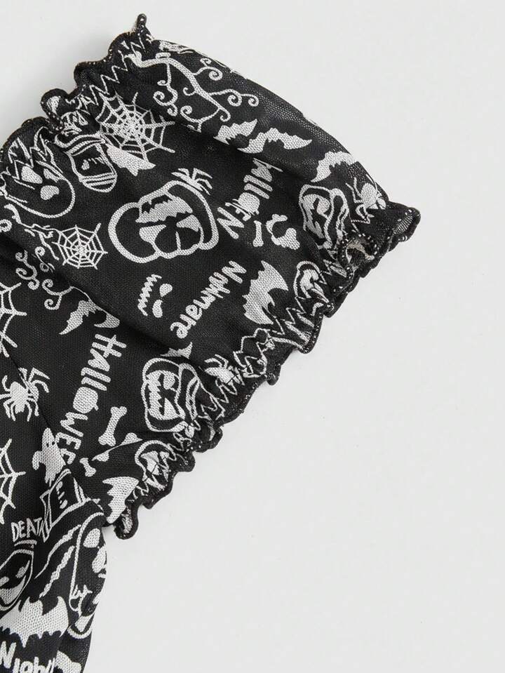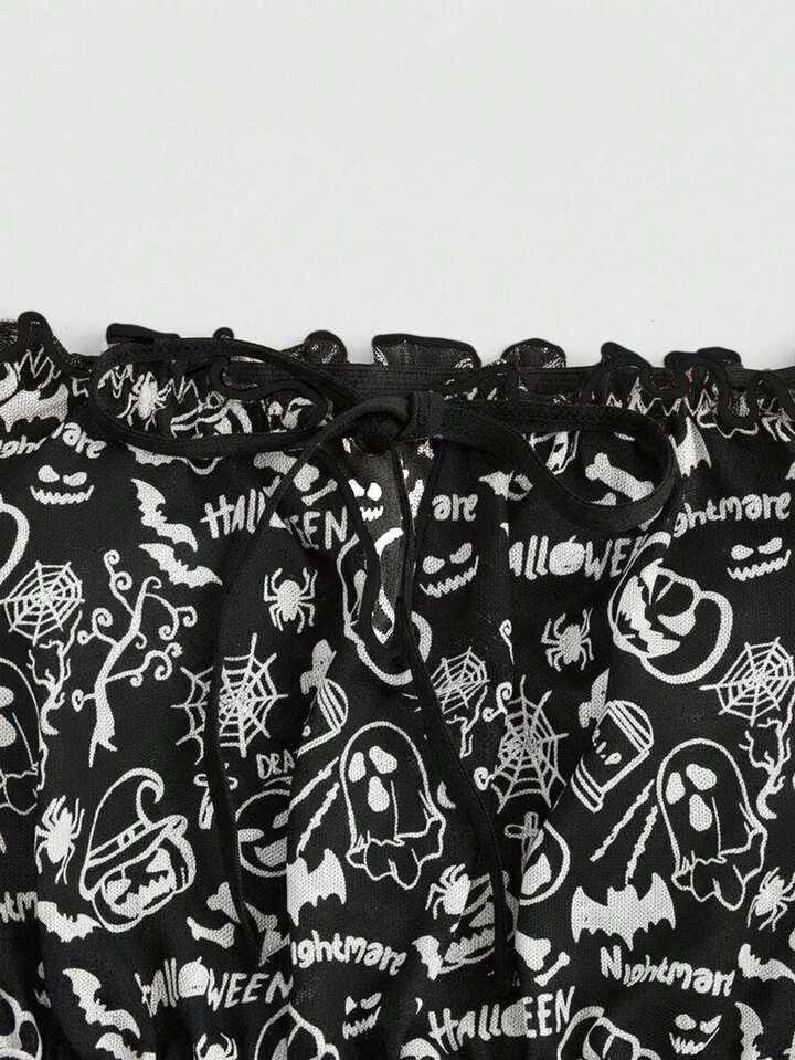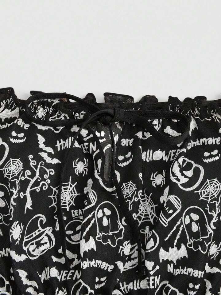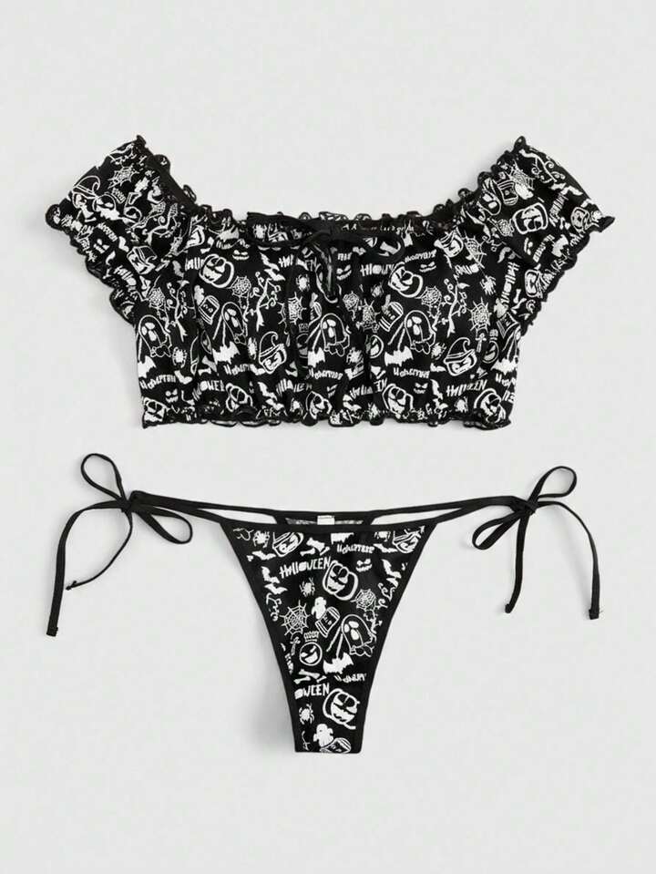 Goth Set di lingerie gotica e dark da Ognissanti, con stampa di pipistrelli e fantasmi, scollo a spalle scoperte, allacciatura e apertura cavallo