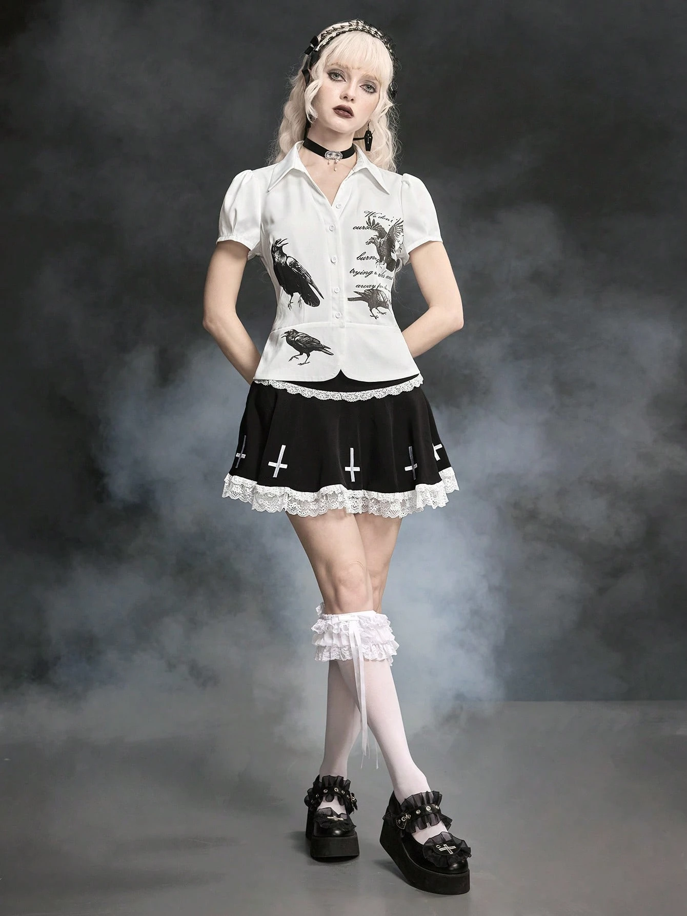 Goth Camicia aderente da donna con maniche a sbuffo e stampa di corvi, stile Lolita gotico