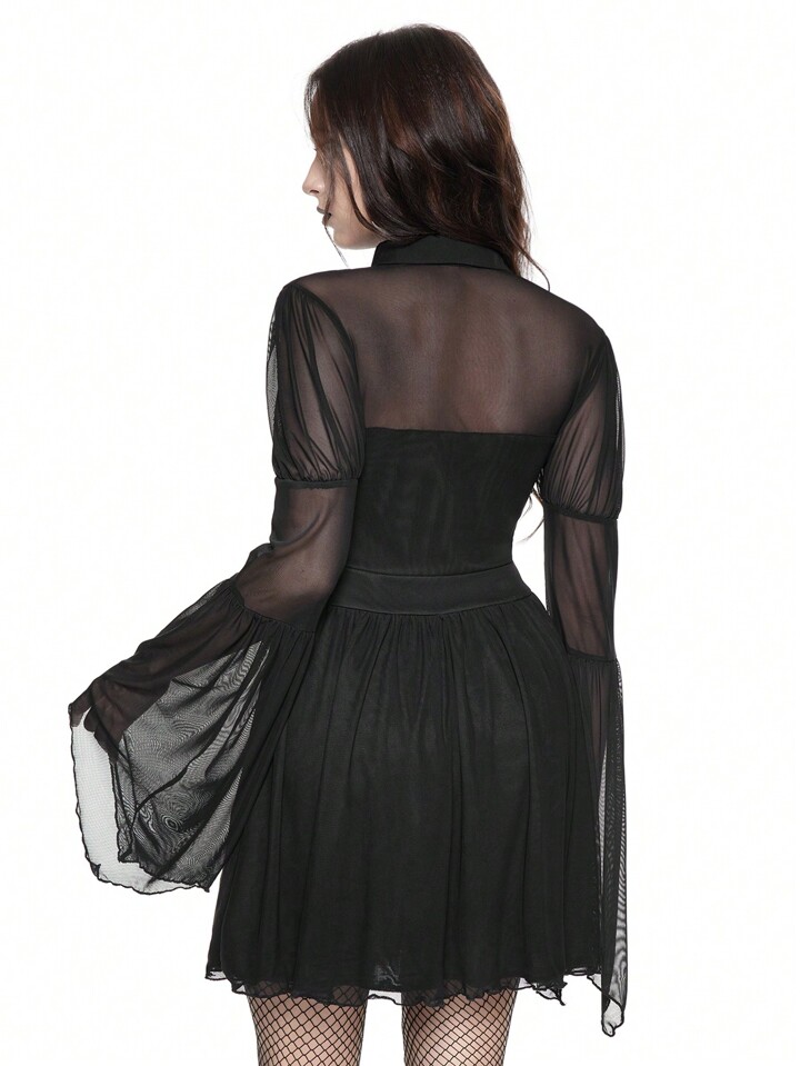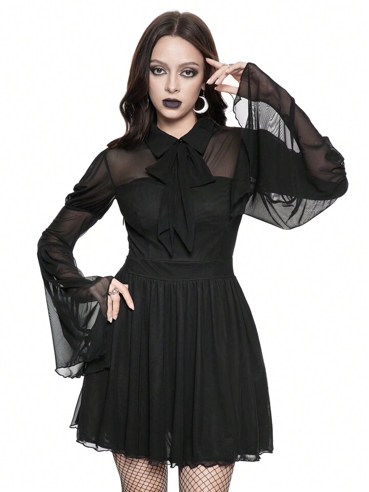 Goth Abito di media lunghezza da donna a tinta unita con maniche a farfalla trasparenti, con lacci, in stile gotico adatto per Capodanno e San Valentino