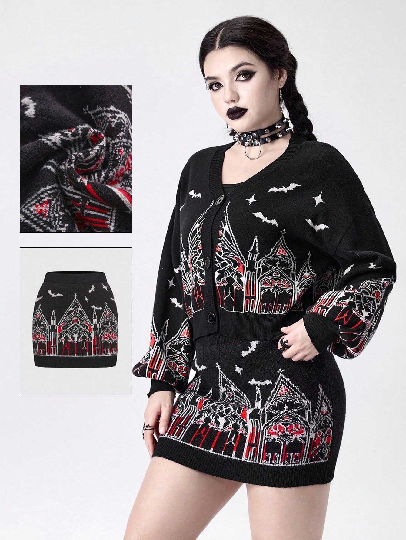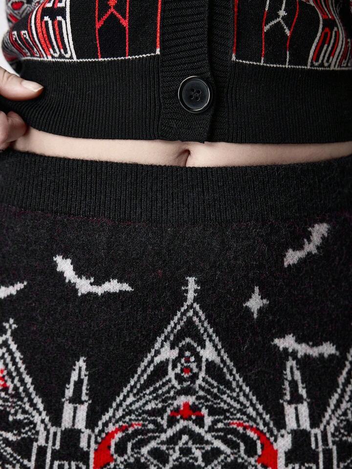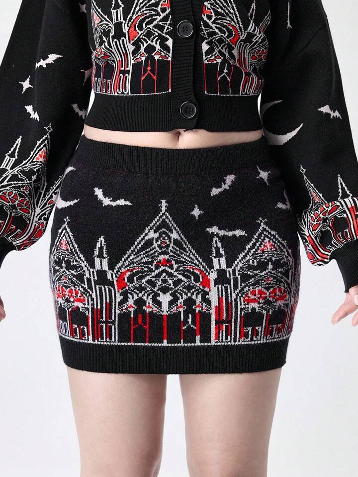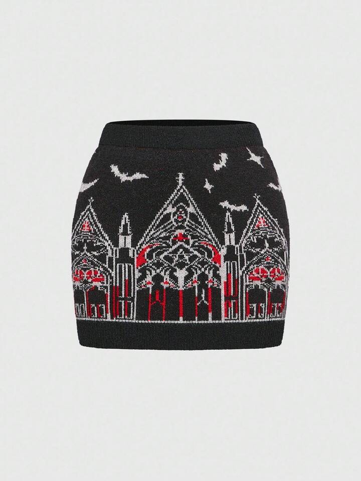 Goth Gonna aderente a mini in maglia con motivo gotico di castello, palazzo e chiesa
