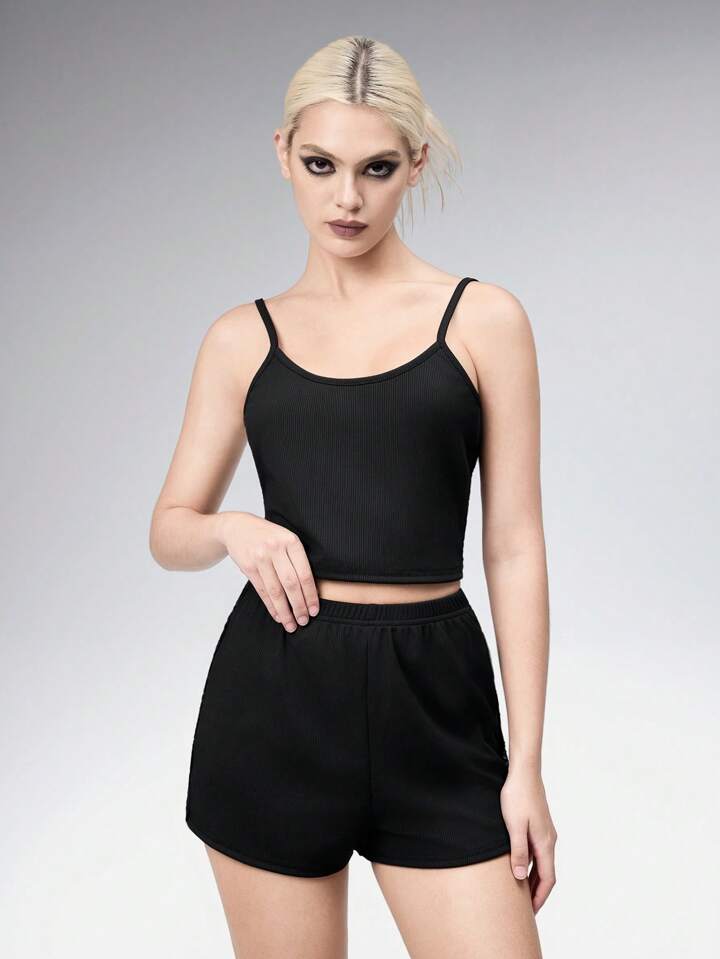 Goth Set pigiama di canotta trasparente e pantaloncini con motivo gotico a costine e croci floccate