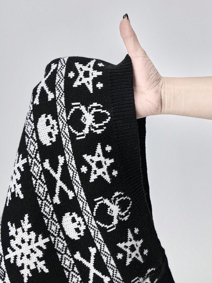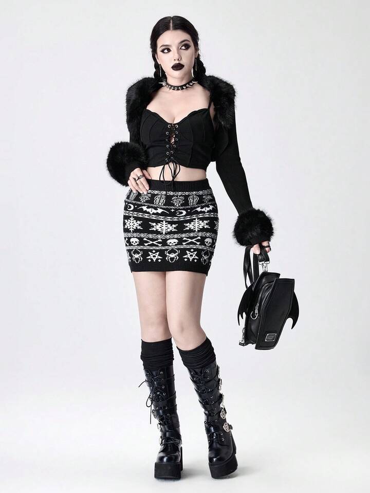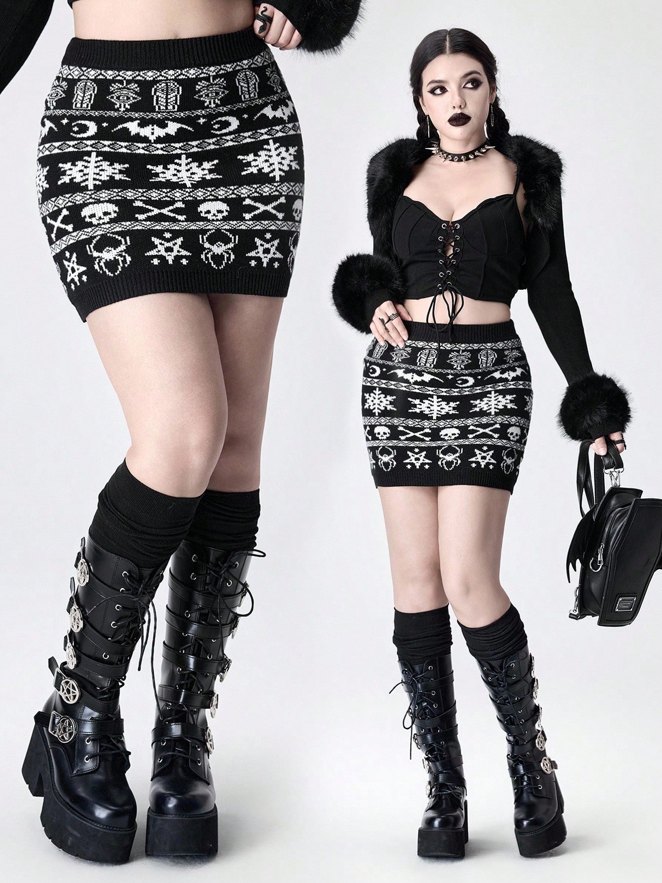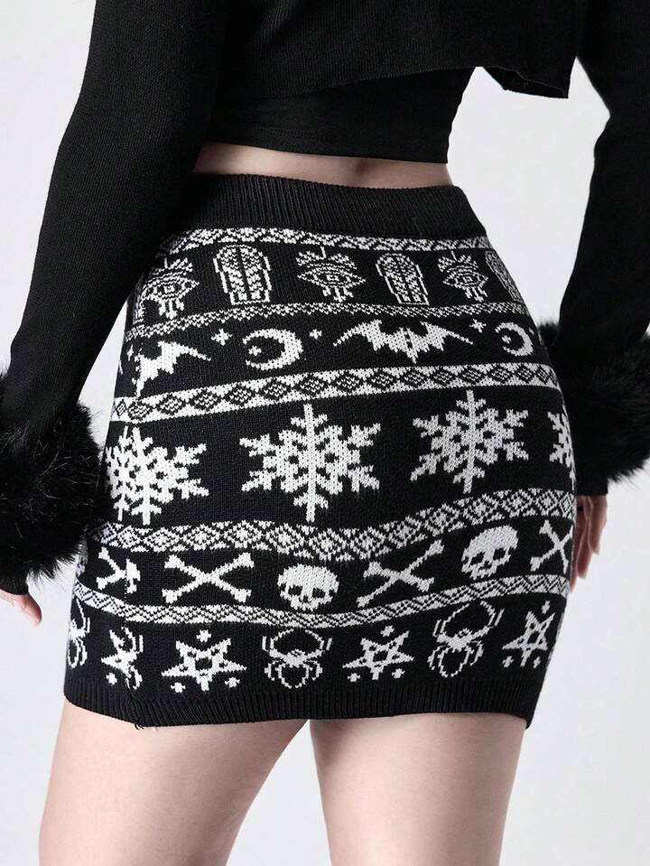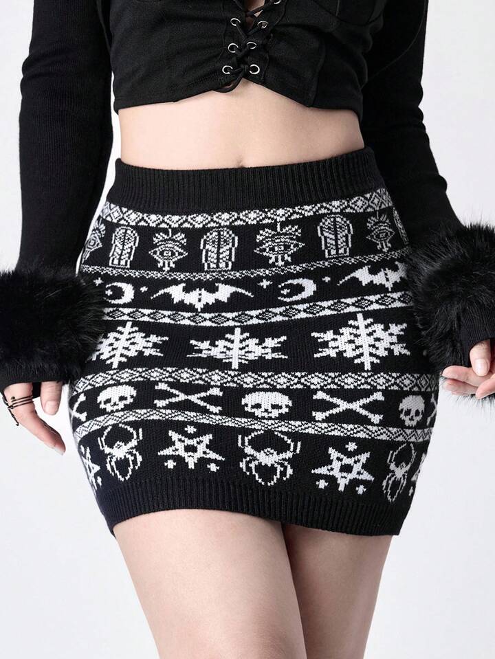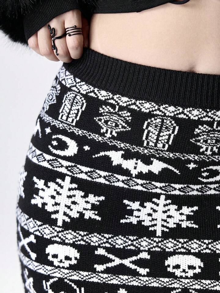 Goth Minigonna aderente in maglia jacquard con motivo teschio gotico, adatta per l'inverno e il Natale