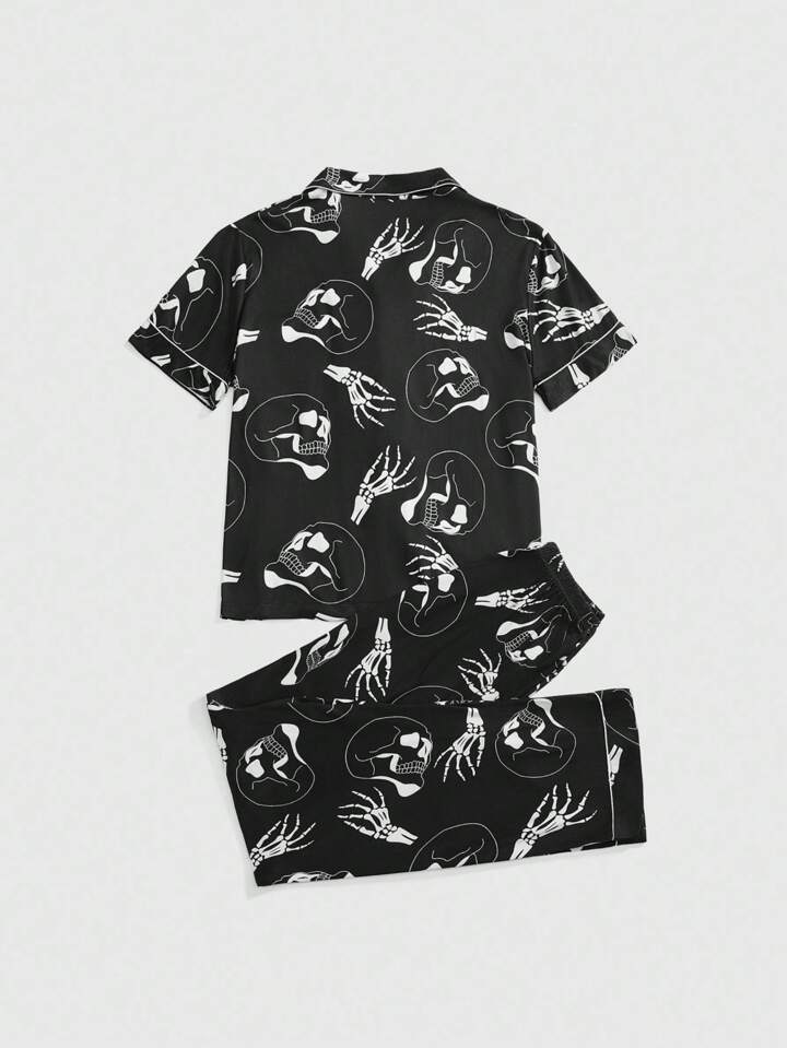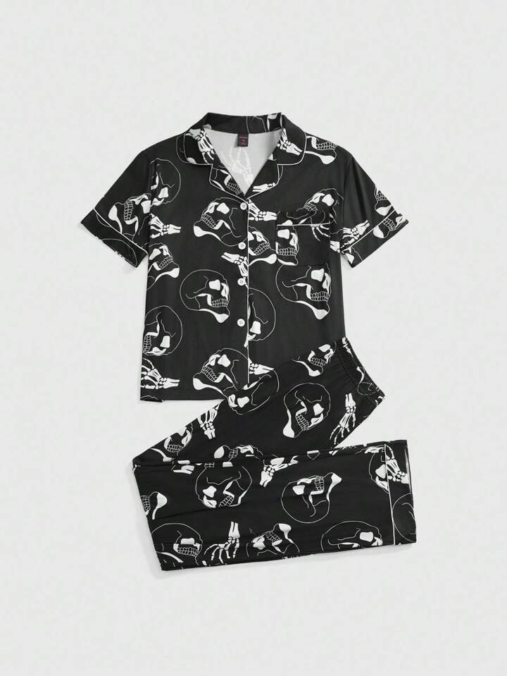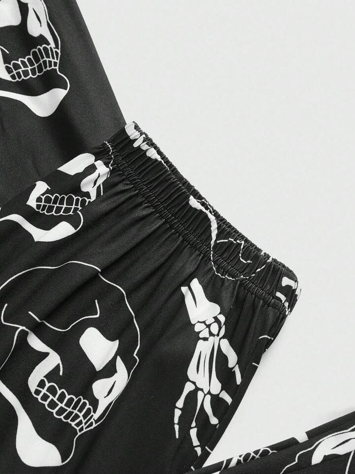 Goth Set di abbigliamento da casa in maglia con stampa gotica a teschio, maniche corte e scollo aperto, adatto per Ognissanti