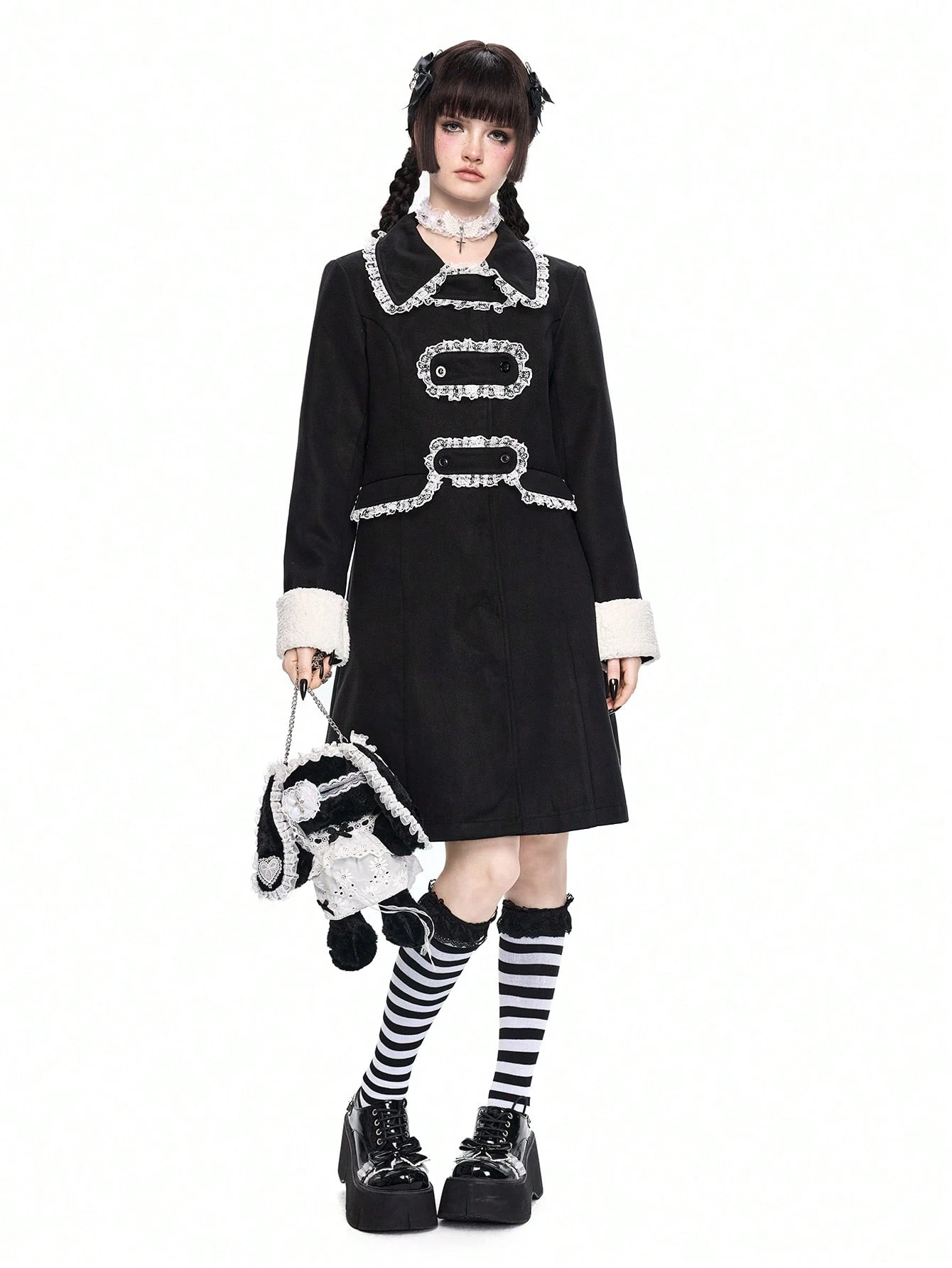 Goth Cappotto in misto lana di stile gotico, aderente, con bordo in pizzo e apertura frontale, di lunghezza media