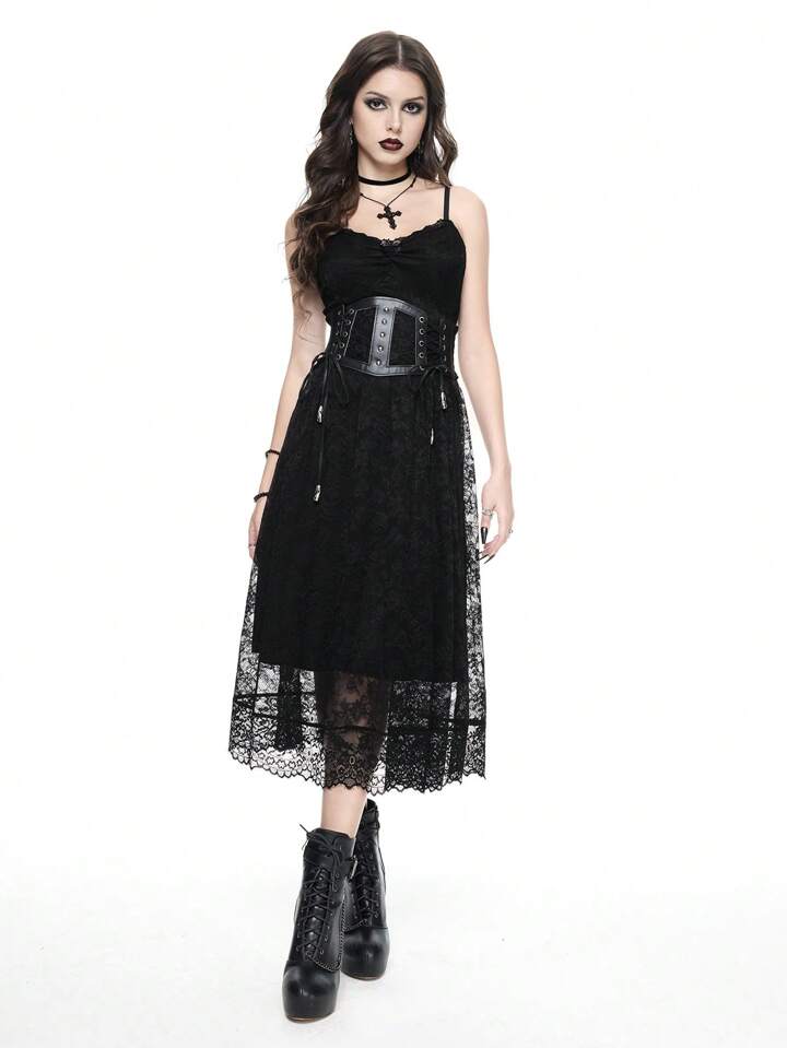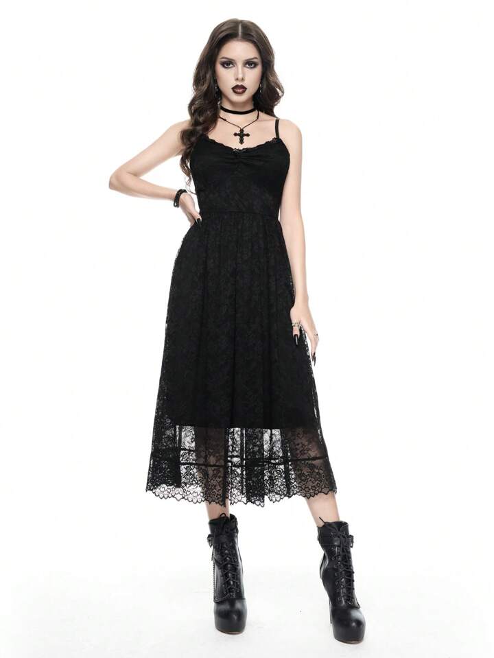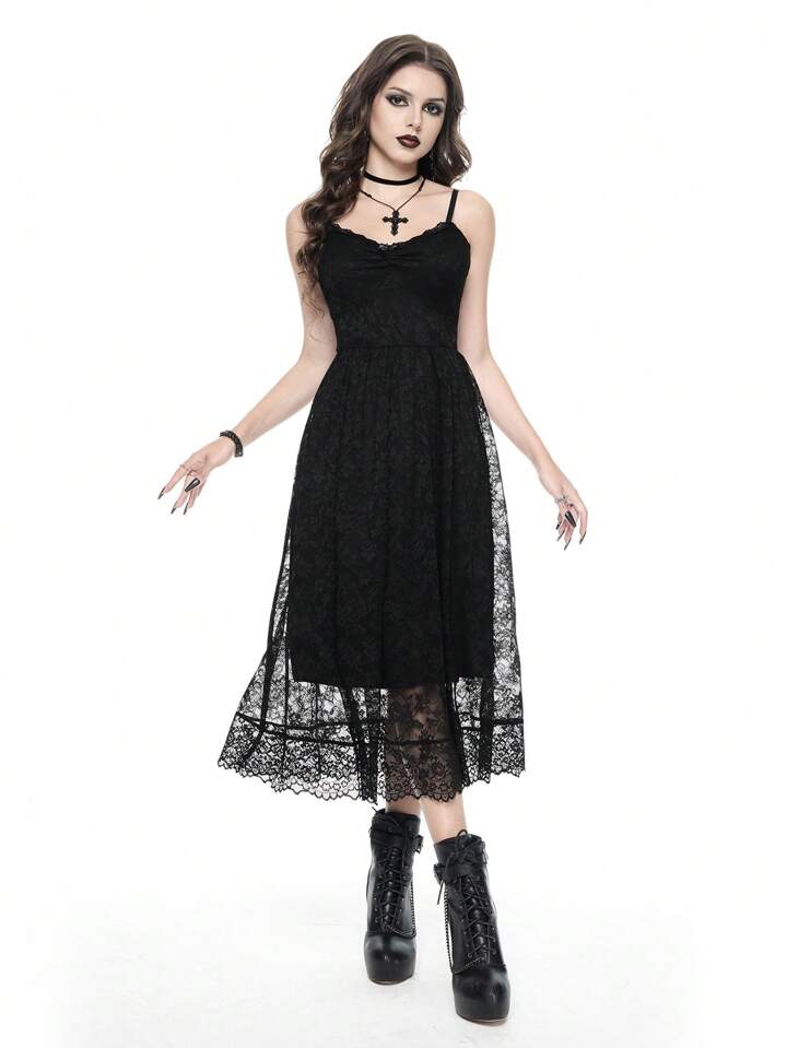 Goth Abito di media lunghezza da donna con spalline a spaghetti e pizzo, in stile gotico