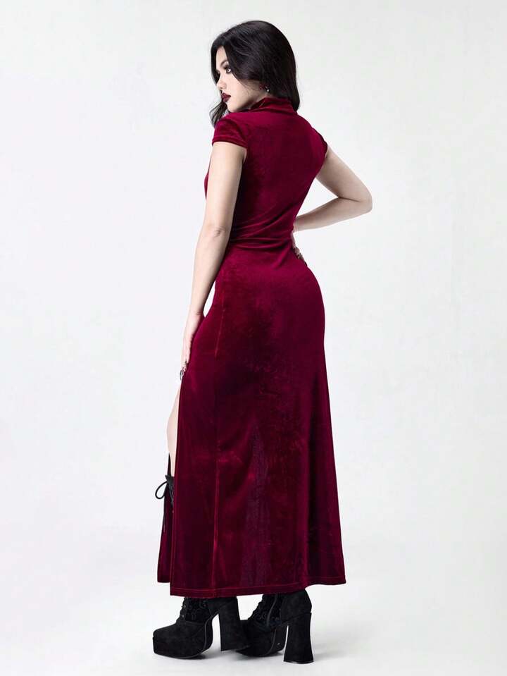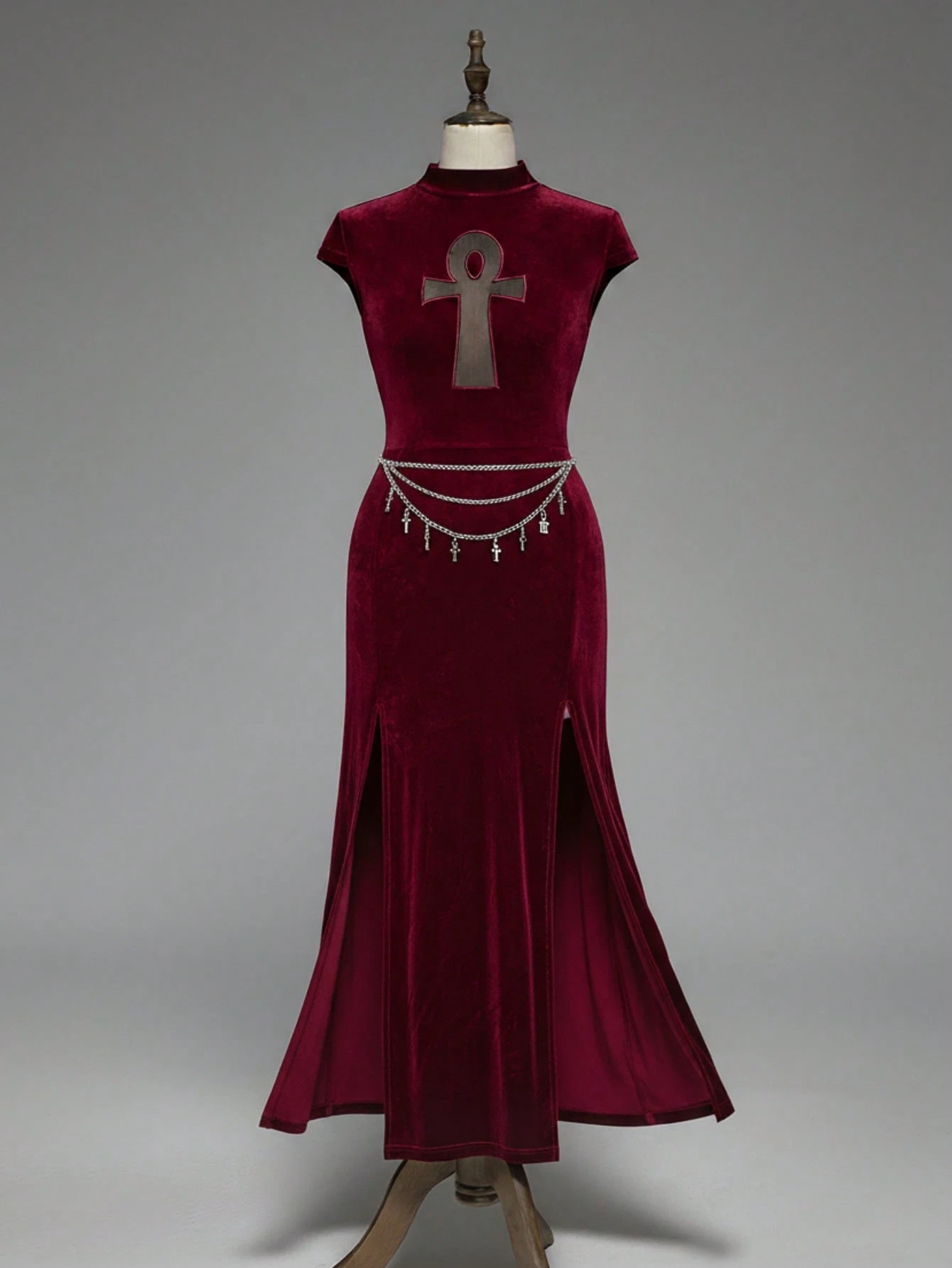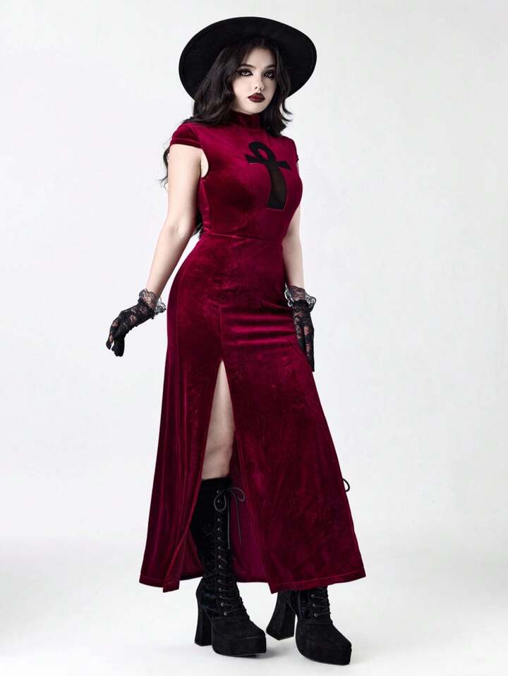 Goth Abito aderente stile gotico-vampiresco con croce traforata, ispirato all'antico stile egiziano, con spacco alto