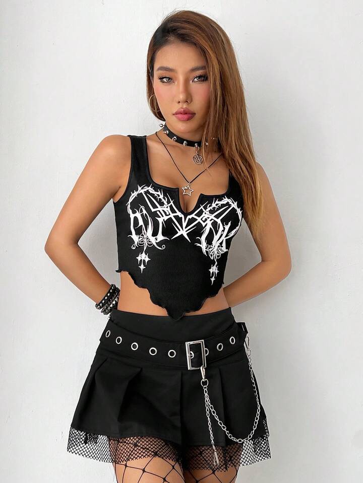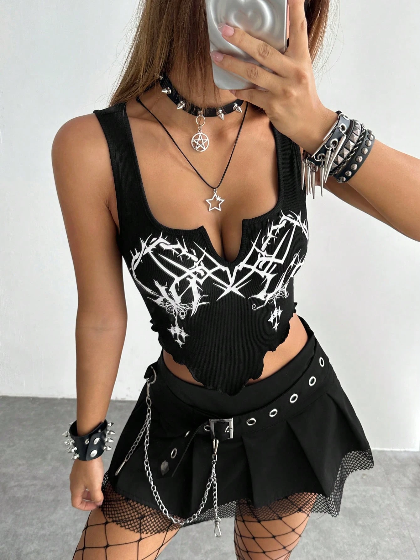 Canotta con stampa grafica scollo dentellato orlo asimmetrico