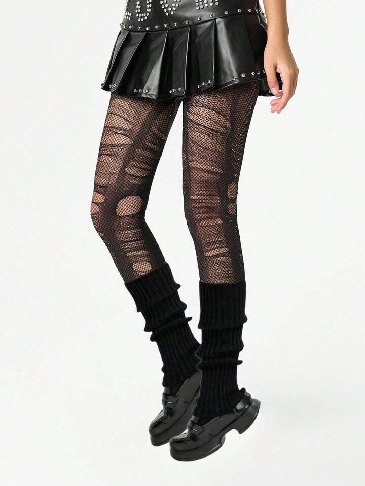 Grunge Punk 1 Paio Di Calze A Rete Nere Con Diamanti Stile Spice Girl + 1 Paio Di Coprigambe Neri Minimalisti, Set Combinato Di Calze A Rete E Calze In Stile Y2K, Adatto Per Combinazioni Di Danza Quotidiana