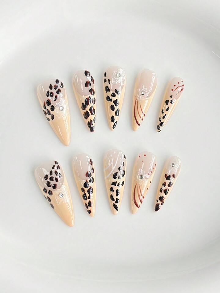 Grunge Punk 10 pezzi di unghie finte con stampa leopardata stile punk per Ognissanti + 3 pezzi di nastro biadesivo, adesivi per unghie gotici leopardati in stile Y2K, decalcomanie per arte di unghie rimovibili e riutilizzabili dipinte a mano, adatti per festival, feste, balli e uso quotidiano
