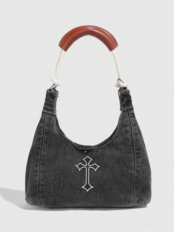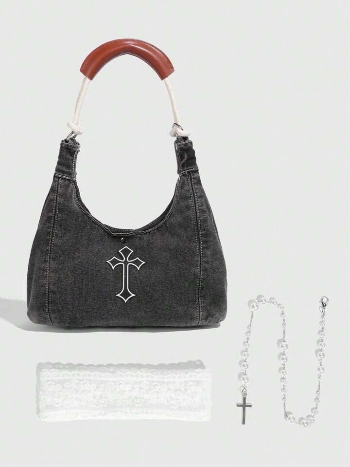 Grunge Punk 1 pezzo Borsa a mano retrò, borsa shopping decorata con colore a contrasto e fiocco di pizzo, stile dolce e cool, adatta per primavera ed estate