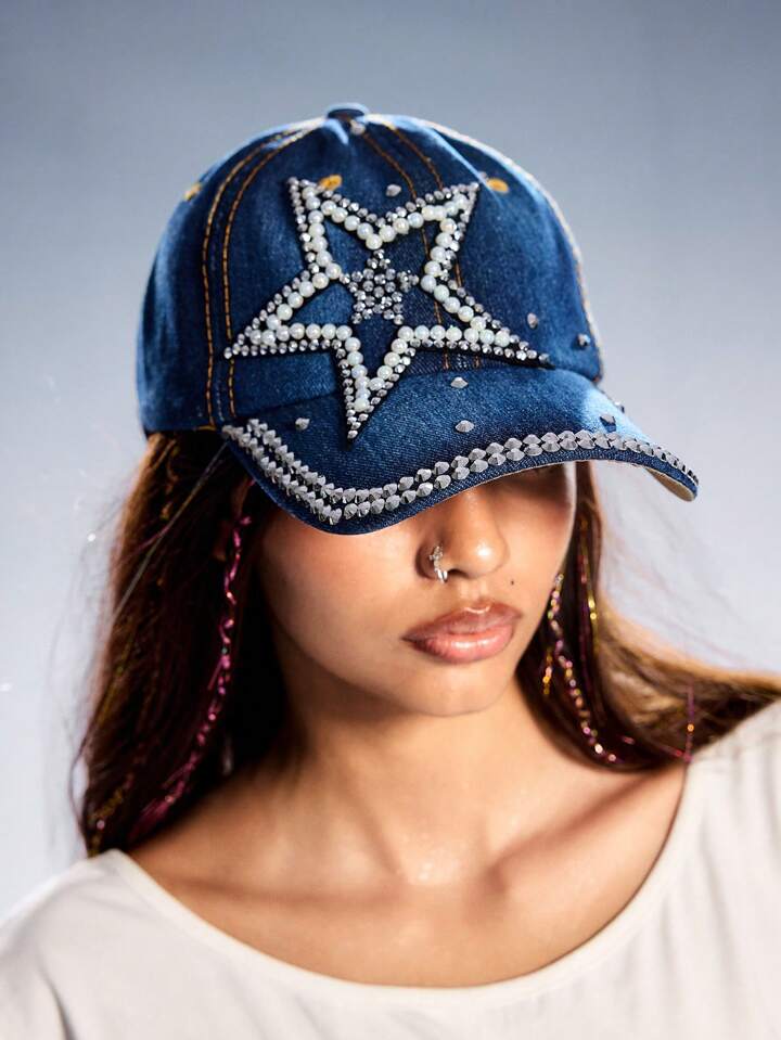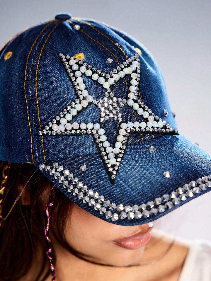 Grunge Punk 1 pezzo Cappello da baseball con strass a forma di stella a cinque punte, moda donna