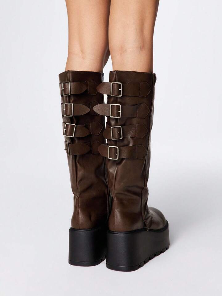Grunge Punk Stivali alla caviglia in pelle marrone con punta tonda, suola spessa, stile punk con fibbia, tacco medio, adatti per l'uso all'aperto, nuovi per l'autunno/inverno 2025
