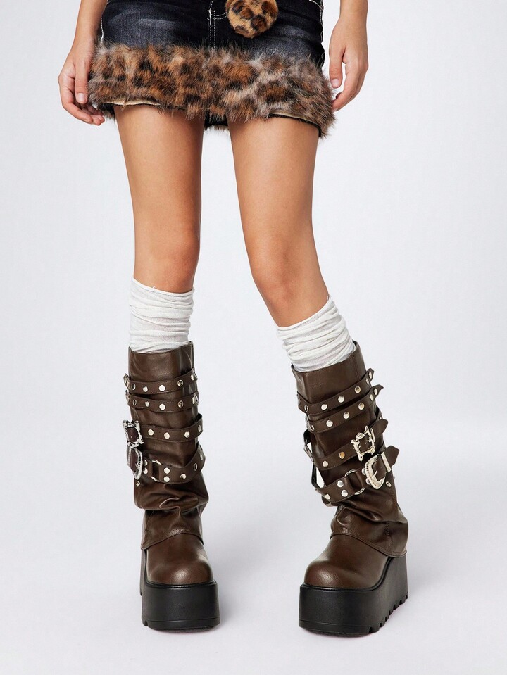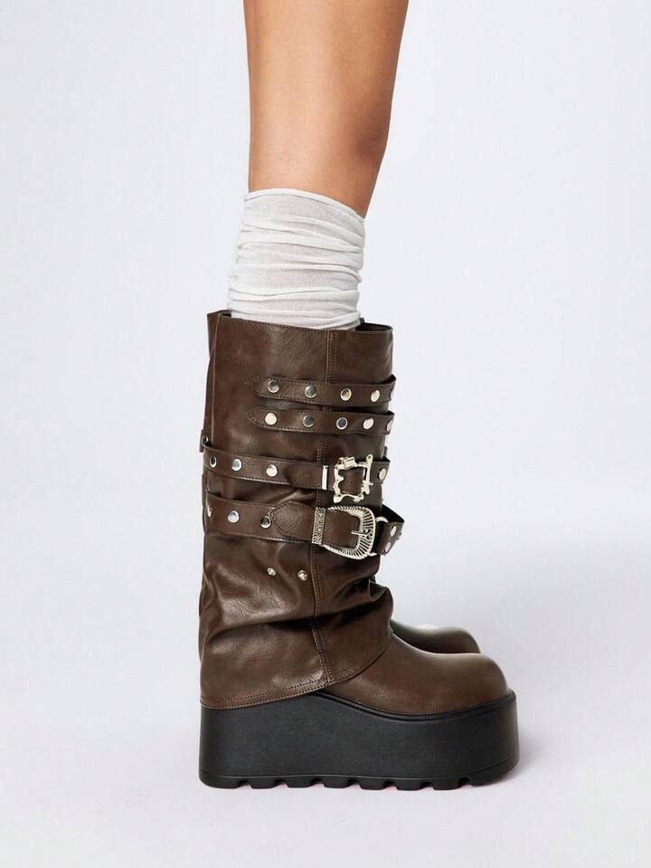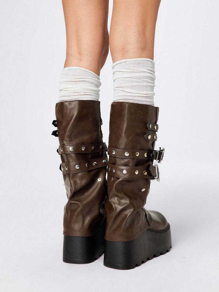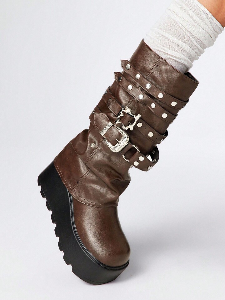 Grunge Punk Stivali alla caviglia con suola spessa, stile punk, con rivetti e fibbie, in pelle, da esterno, moda, infilabili, fino a metà polpaccio, nuovi per l'autunno/inverno 2025
