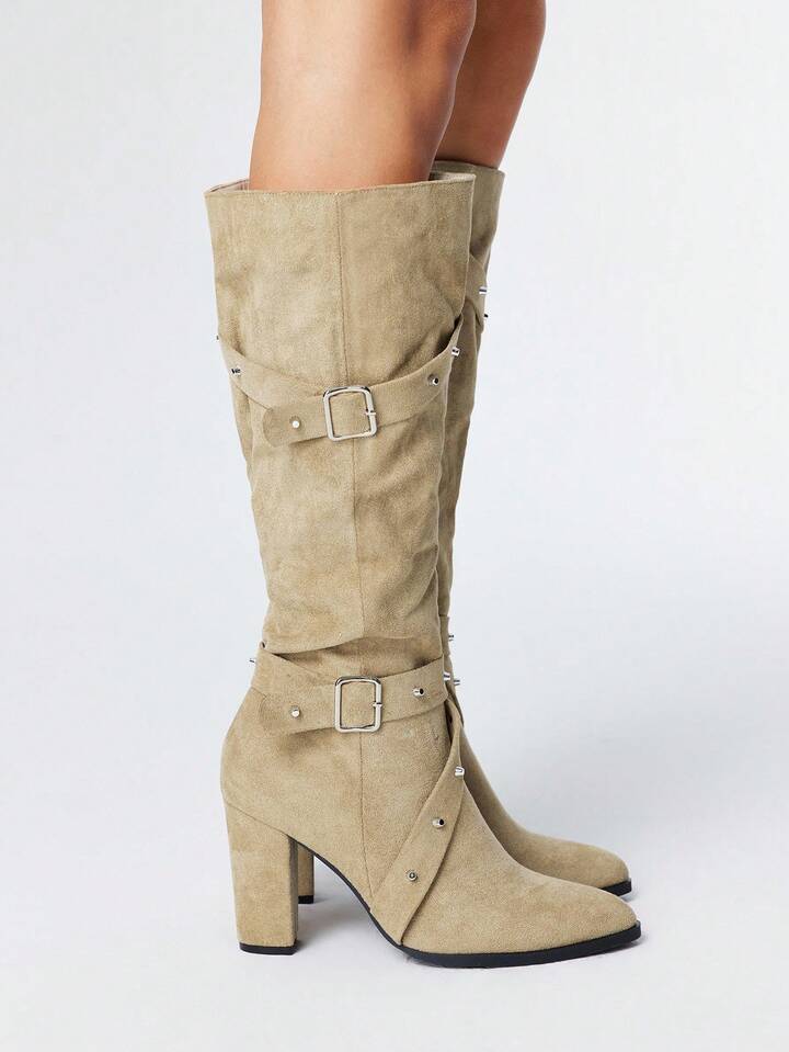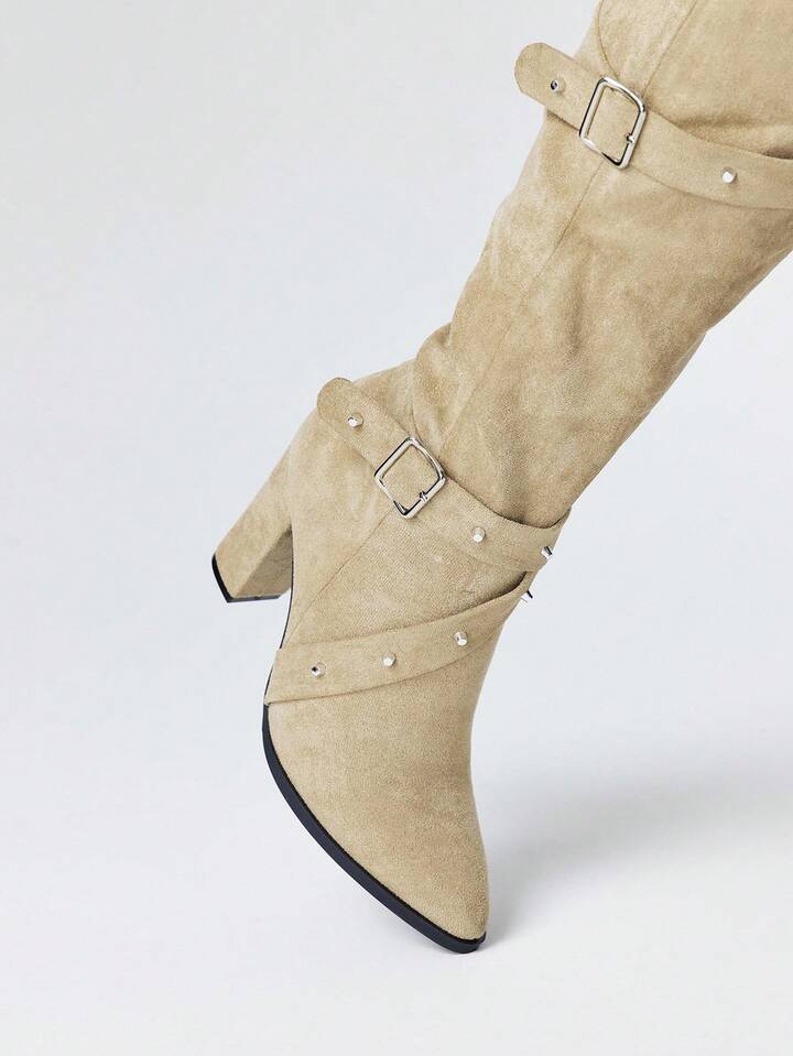 Grunge Punk Stivali alti sopra il ginocchio da donna con tacco chunky e punta affusolata, modello 2025, con fibbia e suola antiscivolo, versatili e adatti per cavalcare