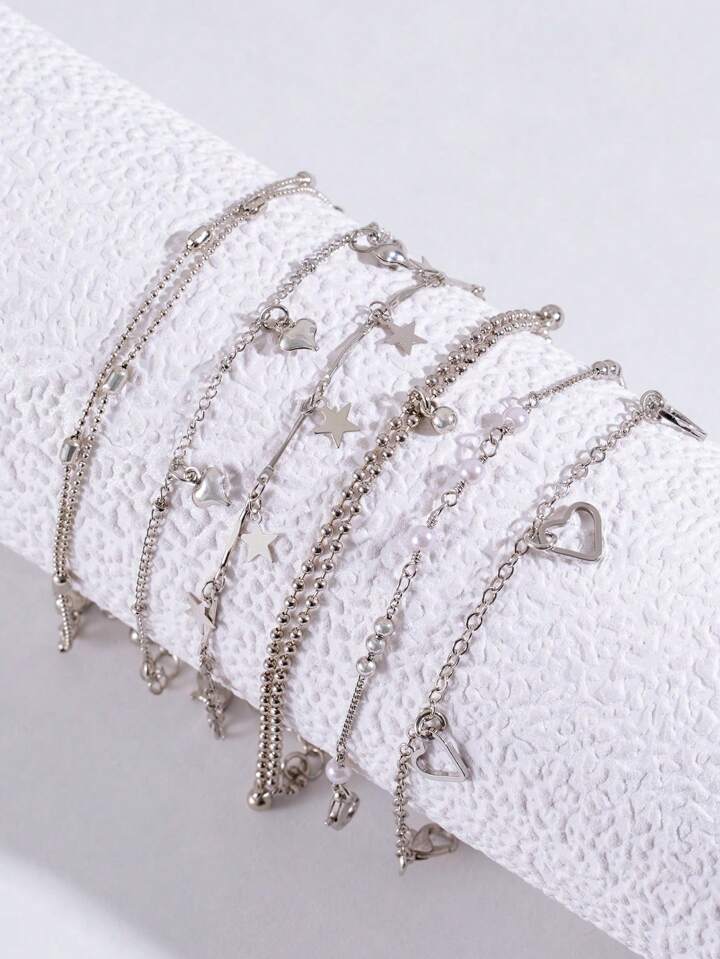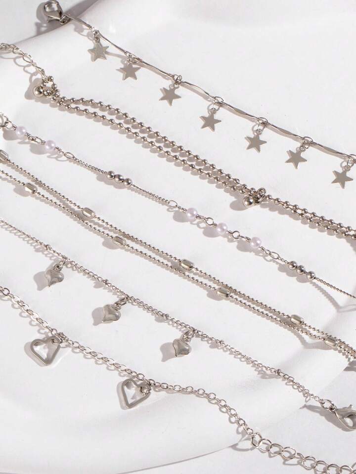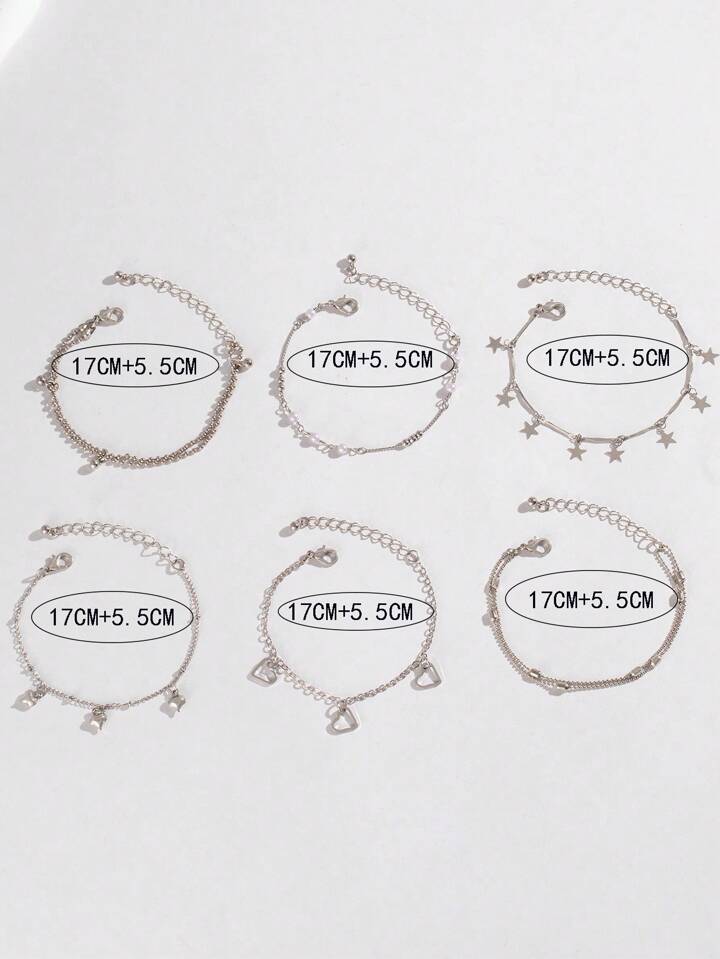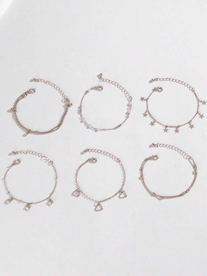 Grunge Punk Set di 6 pezzi di braccialetti alla moda e semplici in lega, con pendenti a forma di stella a cinque punte, cuore cavo tridimensionale e nappine