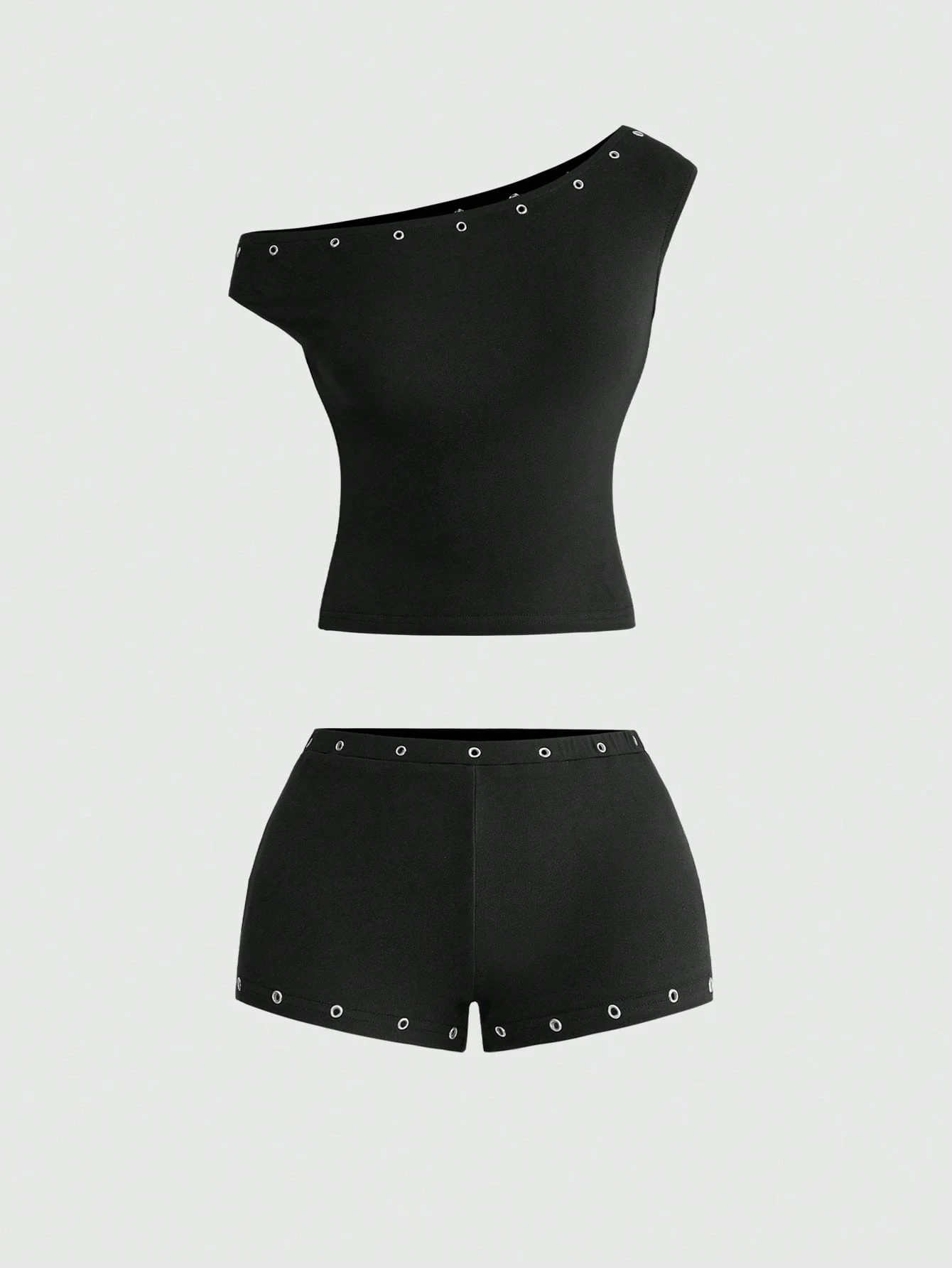 Grunge Punk Set da 2 pezzi composto da top corto con scollo asimmetrico e gommini metallici e mini shorts a vita super bassa