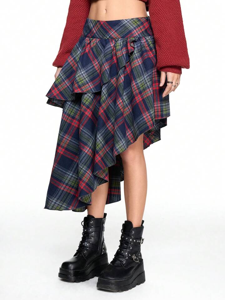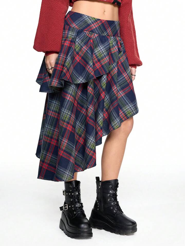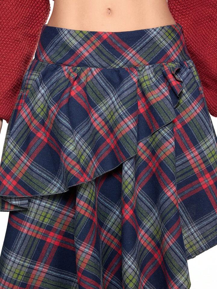 Grunge Punk Gonna ampia in stile boho, college, punk, retrò e Y2K, in plaid misto con orlo asimmetrico, effetto patchwork sovrapposto e vestibilità morbida per le donne