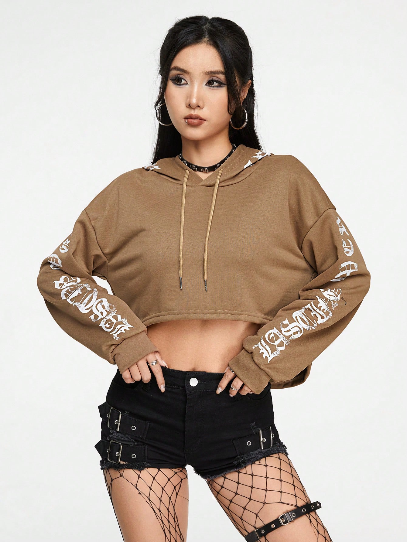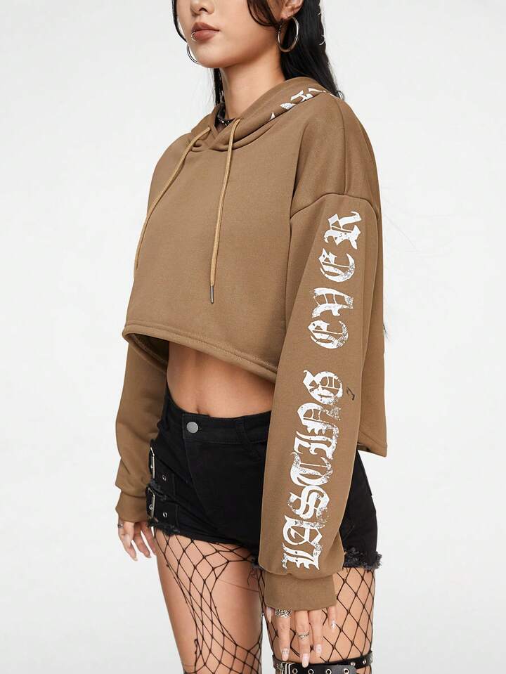 Grunge Punk Felpa corta casual con stampa di lettere, ampia, per donna, colore cachi, adatta per autunno/inverno