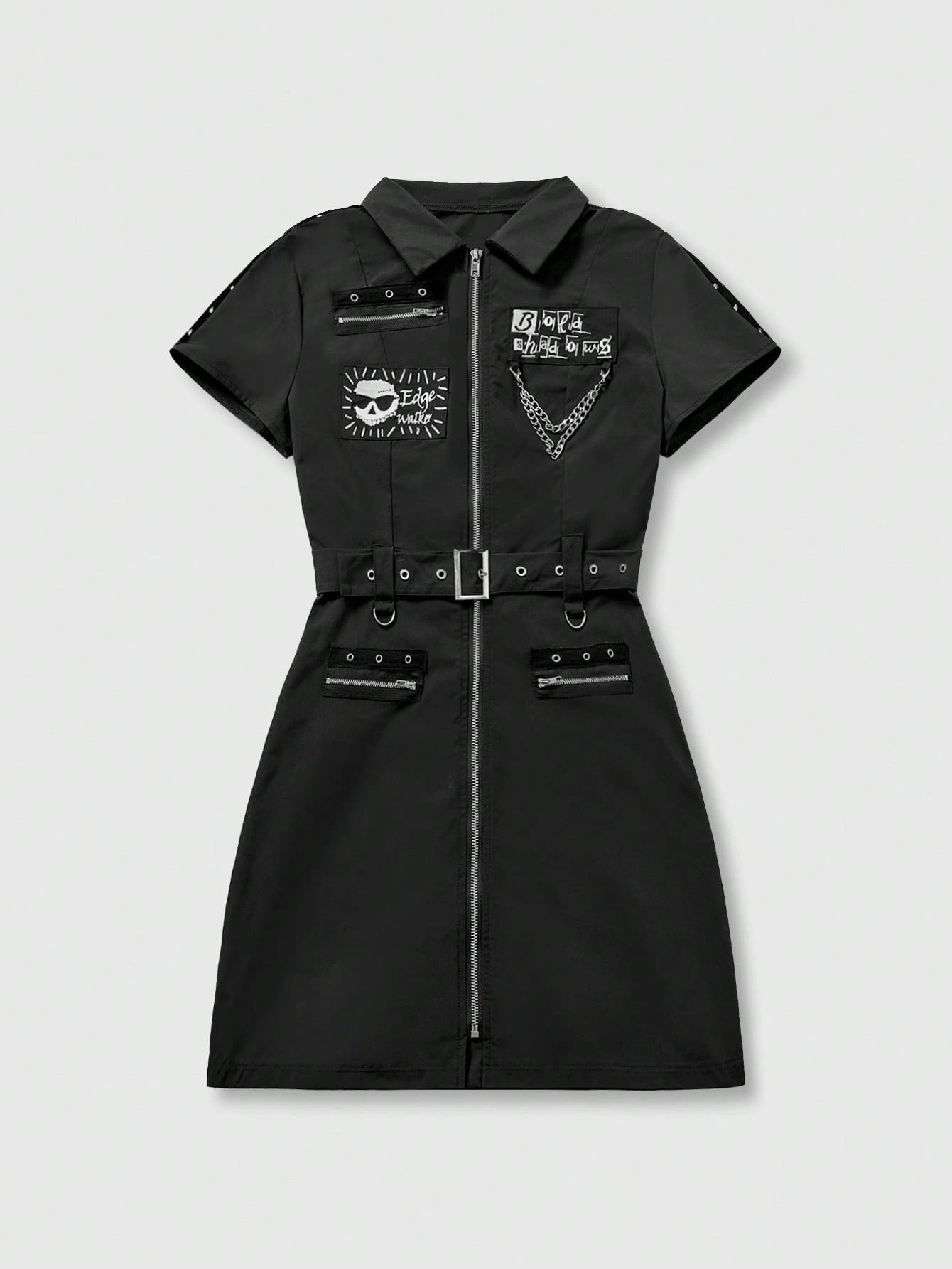 Grunge Punk Abito attillato casual da donna con stampa teschio e decorazione catena metallica punk