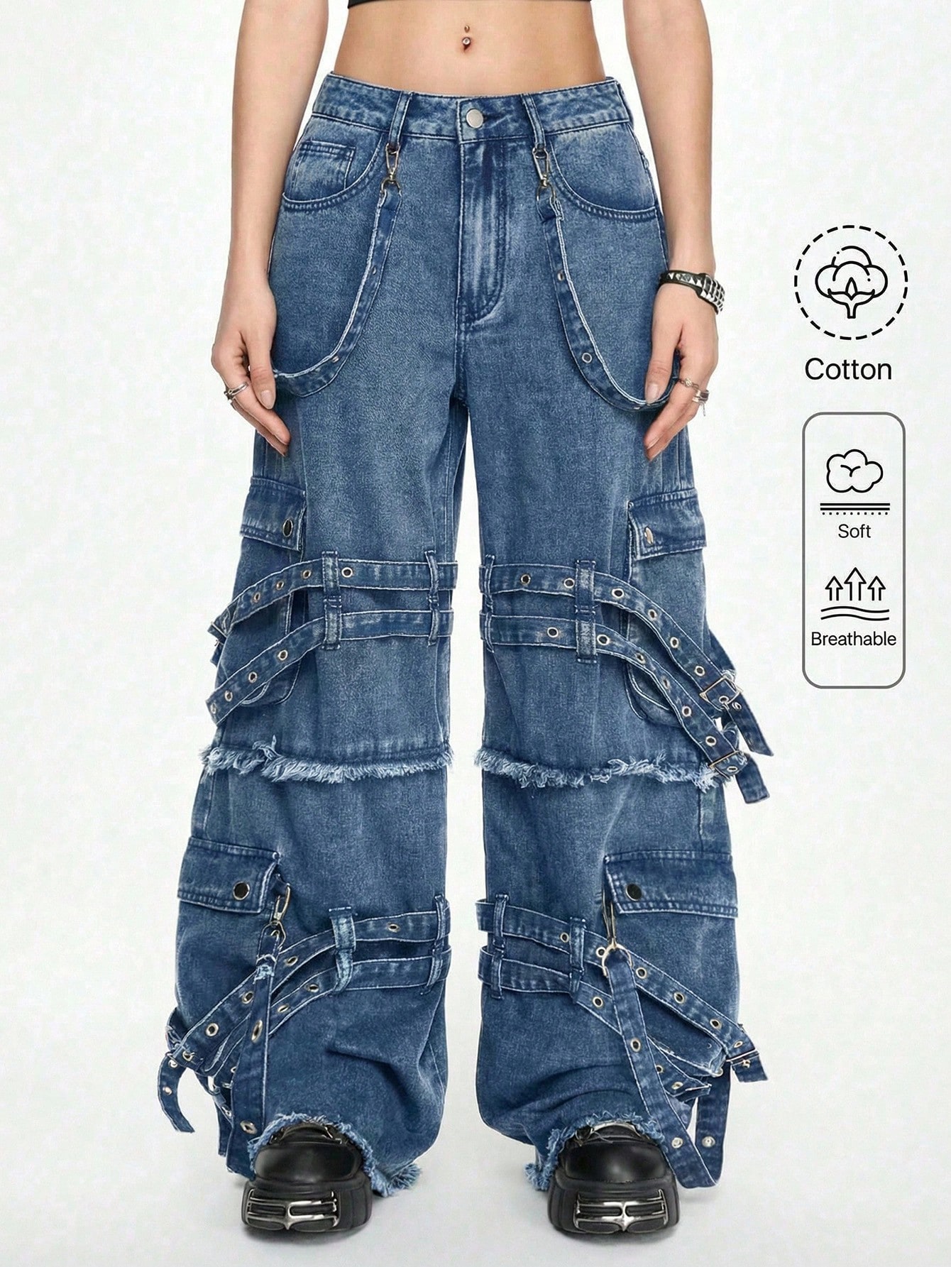 Grunge Punk Pantaloni di jeans a gamba larga da donna, stile casual punk di strada, con decorazioni in nastro e rete metallica