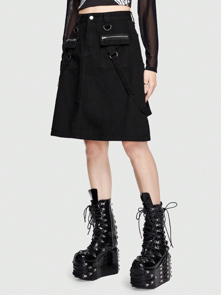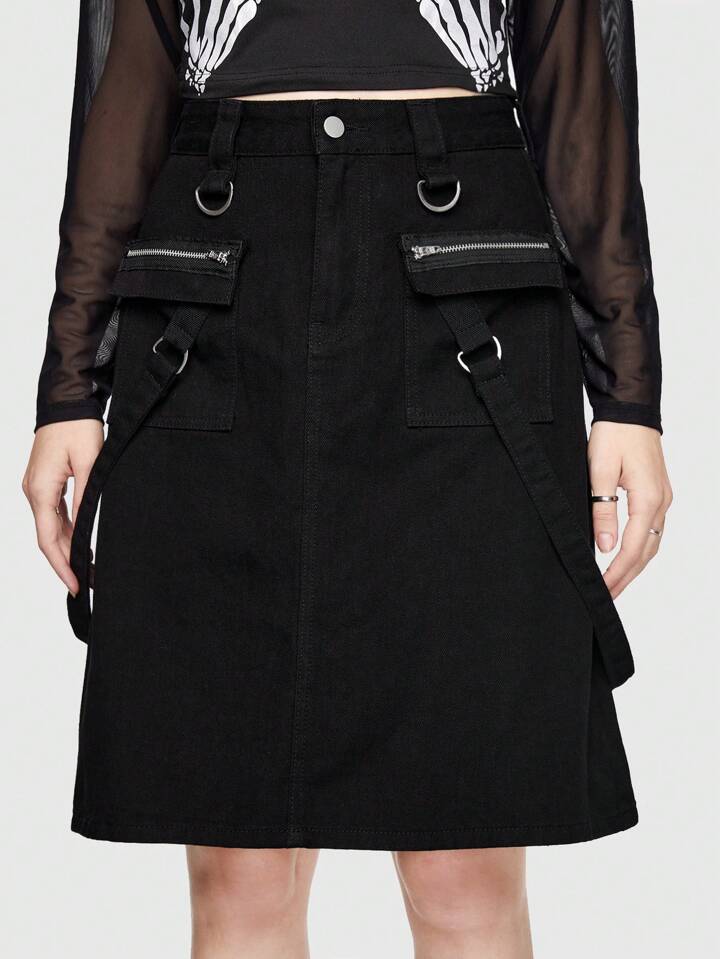 Grunge Punk Gonna casual in denim a linea di colore solido in stile street con zip pesante in metallo