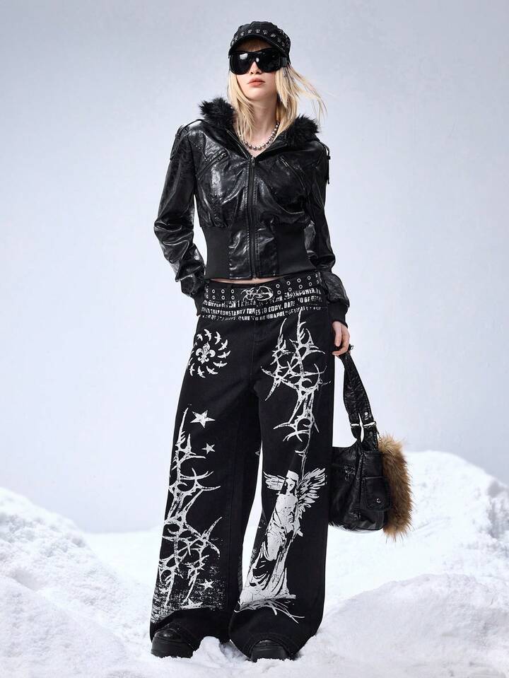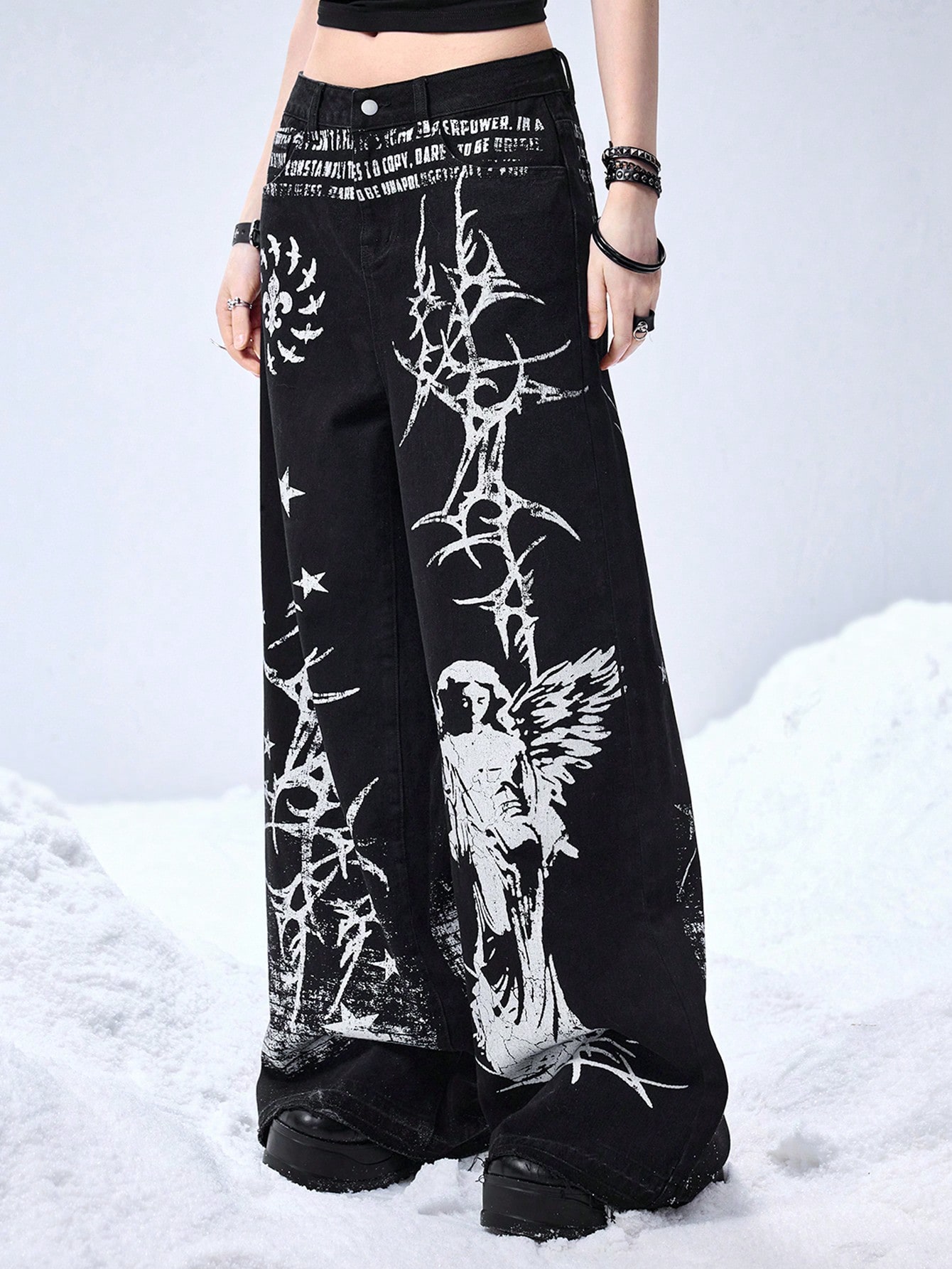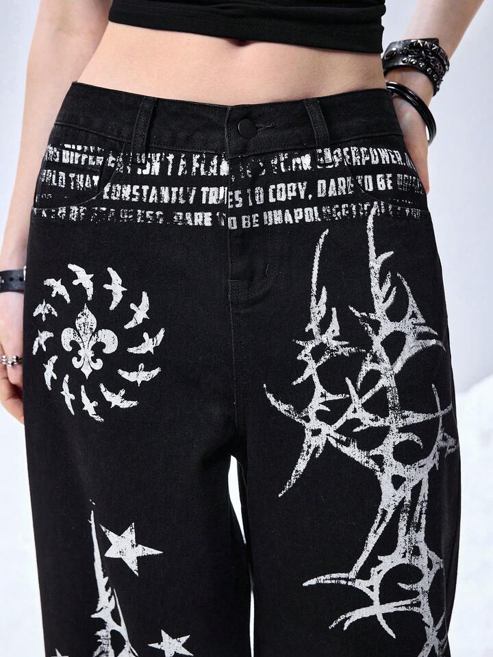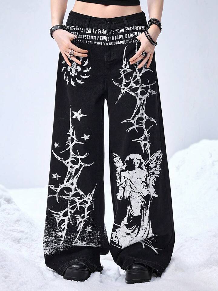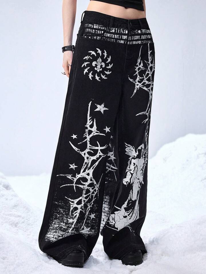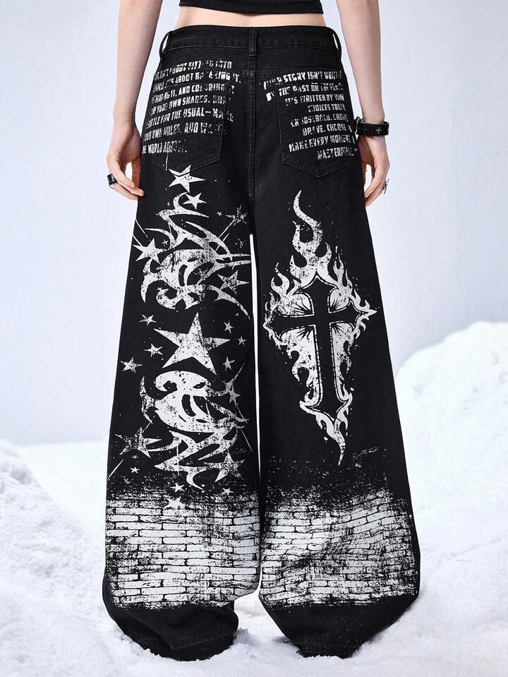 Grunge Punk Jeans a gamba larga da donna stile punk scuro con decorazioni a croce, stelle, spine e muro di mattoni