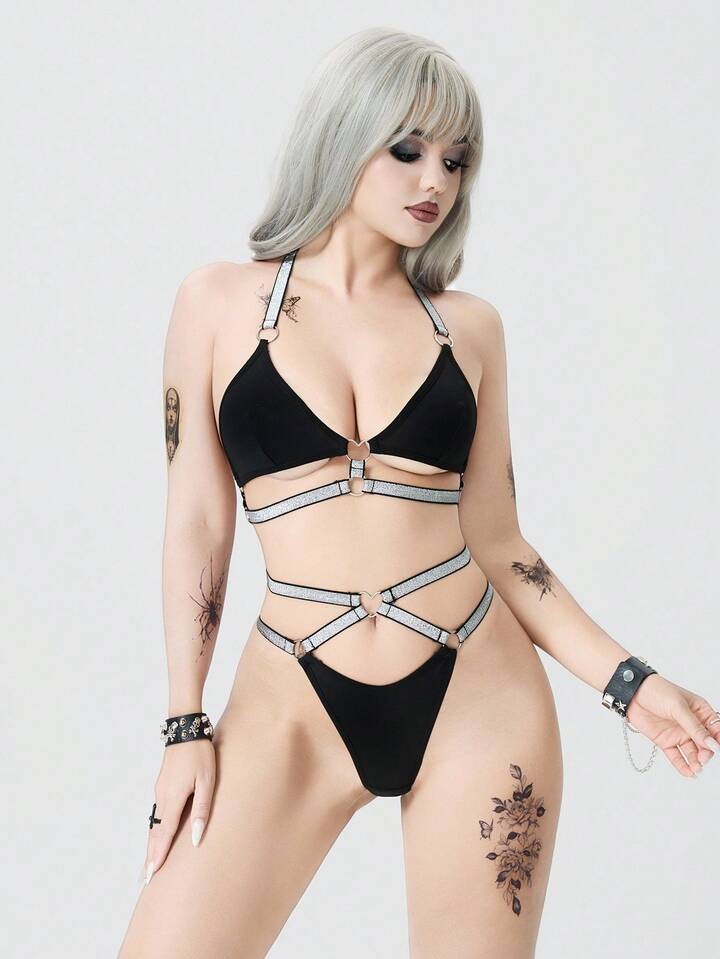 Grunge Punk Set di lingerie con bralette e perizoma, con fibbia a cuore in nastro argentato stile punk scuro, biancheria intima sexy