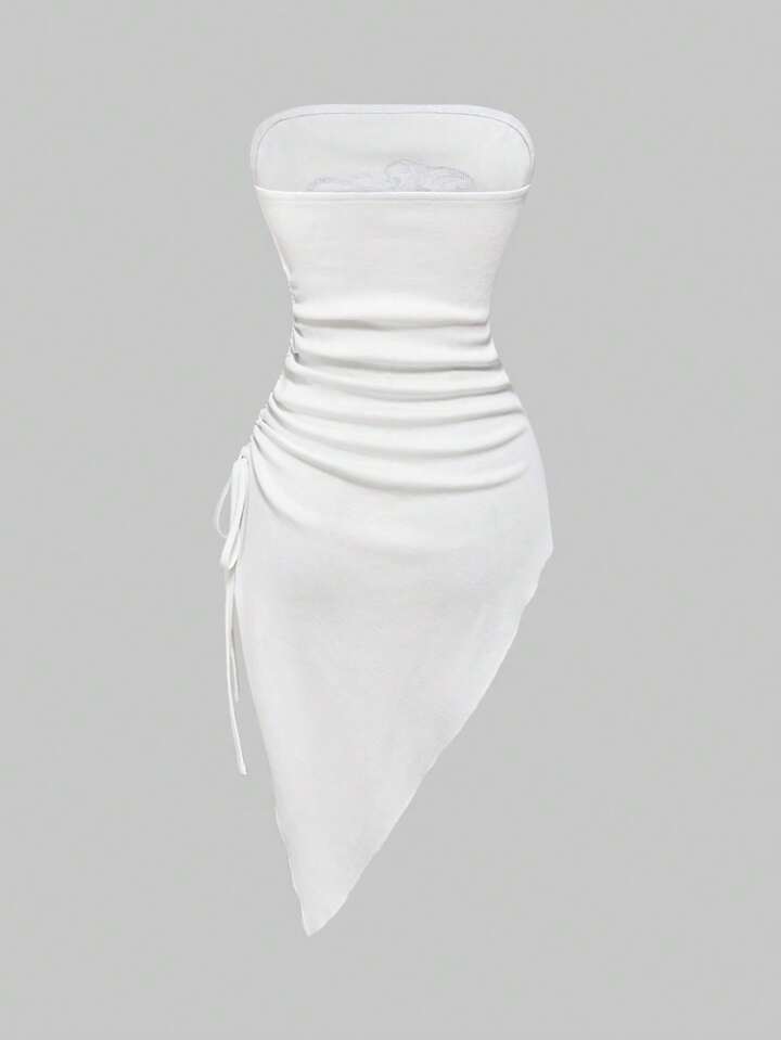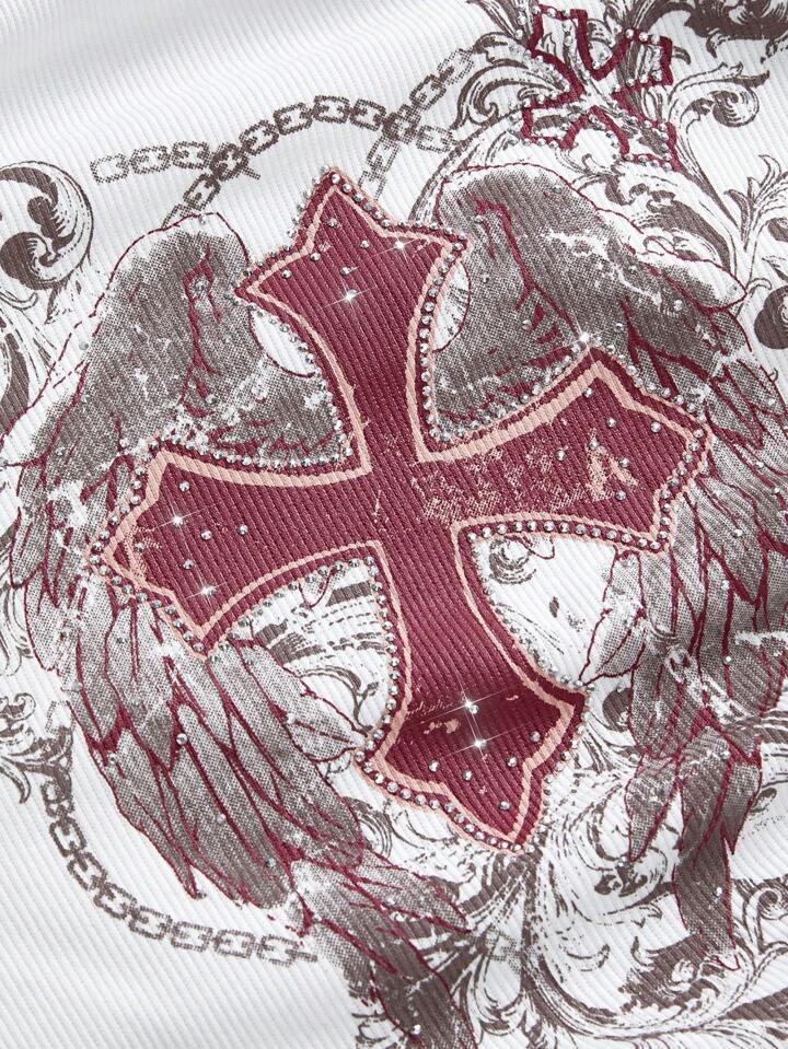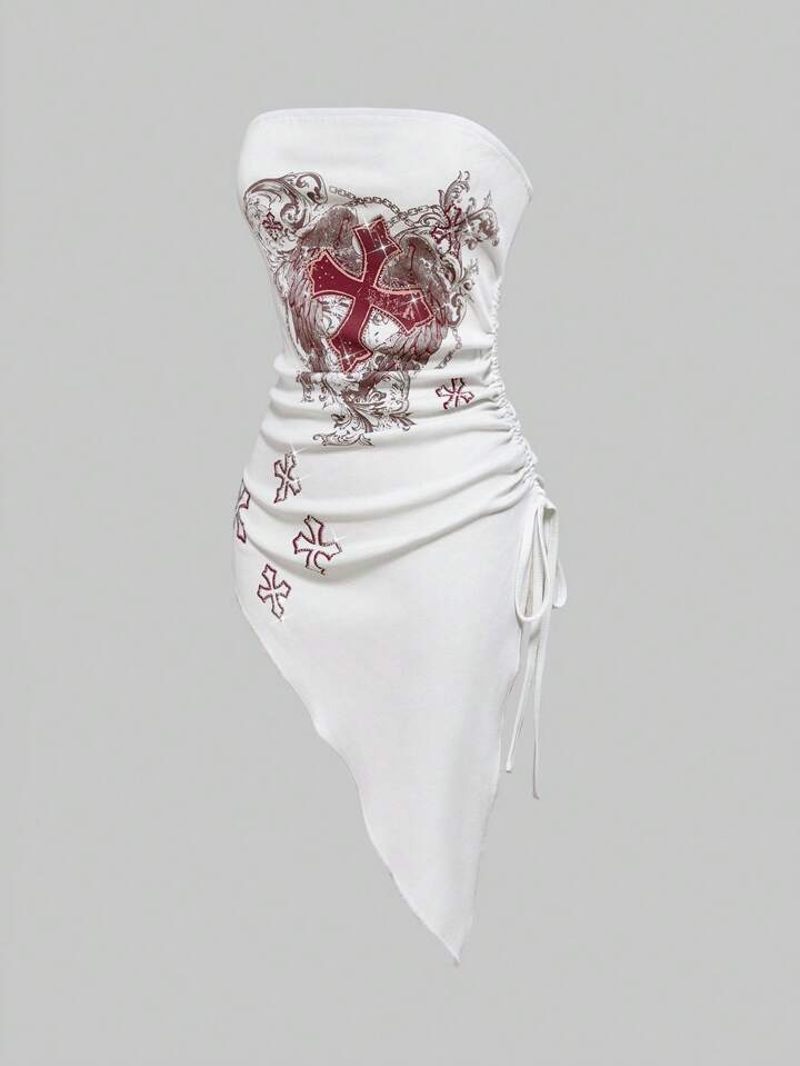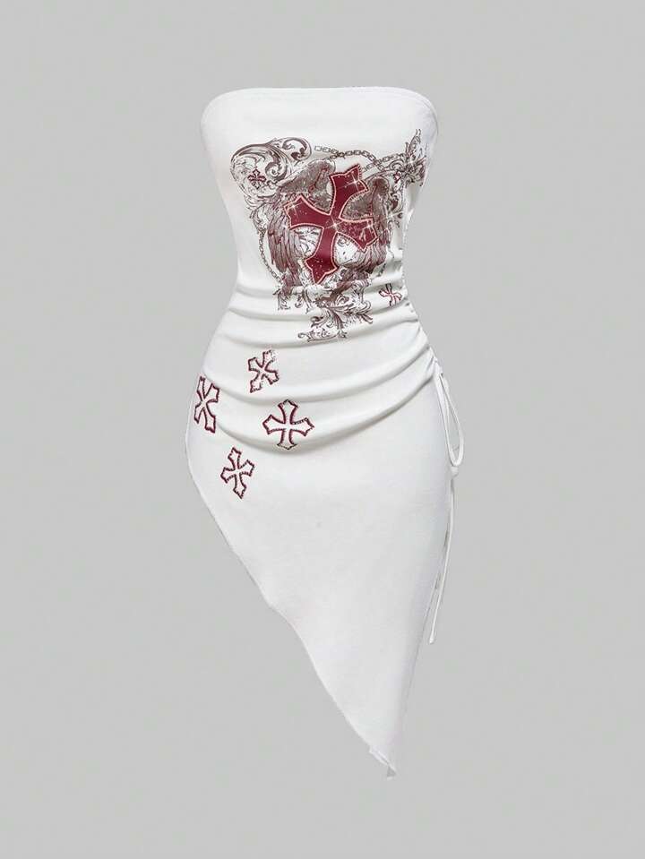 Grunge Punk Top tubo da donna con design asimmetrico plissettato, stile punk scuro, decorato con cristalli a forma di croce